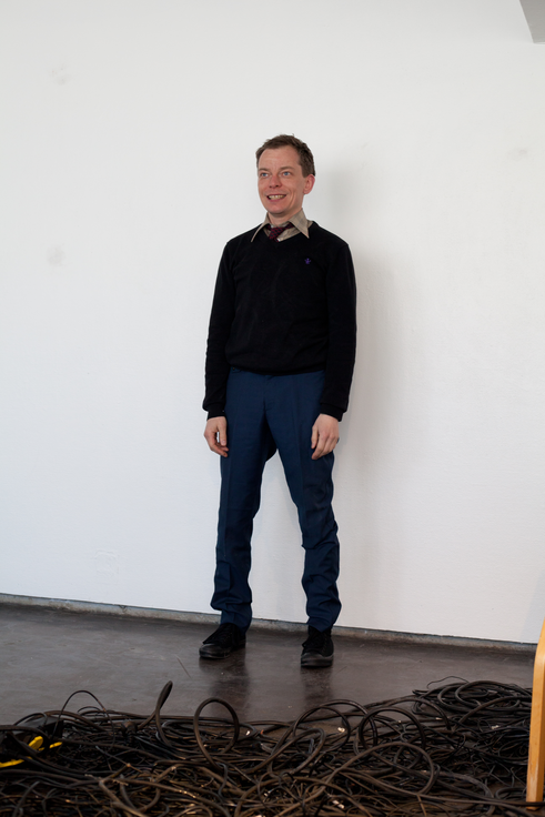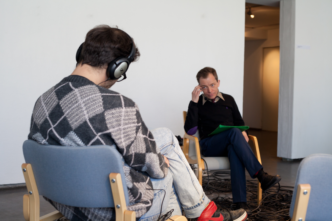 I did a series of five performances in The New Performance Festival in Turku, from 3 to 5 May 2012. Each performance lasted one hour and took place in the Titanik Gallery. The room was 40 m2, with large windows on the one side. For the performance the windows were covered so that subdued light entered the room, but it was not possible to see out of or into the space. At the beginning of the performance I sat on a chair facing the audience, who sat in a semi-circle around me. There was lot of black electric cable and wire on the floor, creating a kind of ‘nest’ or ‘network’ between myself and the audience. In the beginning, I asked three to five people from the audience to become participants in the performance. They were asked to sit in different chairs closer to me. These participants heard my questions through headphones, while the rest of the audience as witnesses, heard my voice normally without amplification. Participants were asked questions about the machines they have, and eventually they were asked to choose one machine, which they felt a particularly close contact with and wanted to work with.