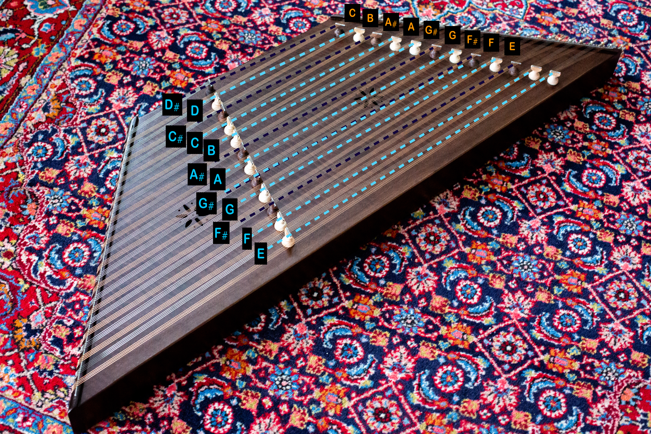 The instrument spans three octaves, with some additional notes in the fourth position. These later notes are less common and requiring extra effort to reach. The pictures below illustrates the various positions on the santur, and the pitch of each bridge.