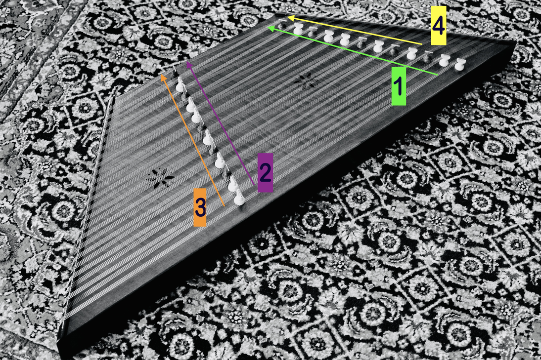 P.s.: Because of the length and material of the strings, harmonics in the first position are most commonly used on the santur. However, it is also possible to produce harmonics in the second position.