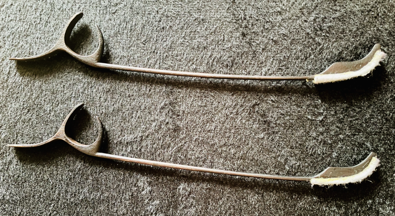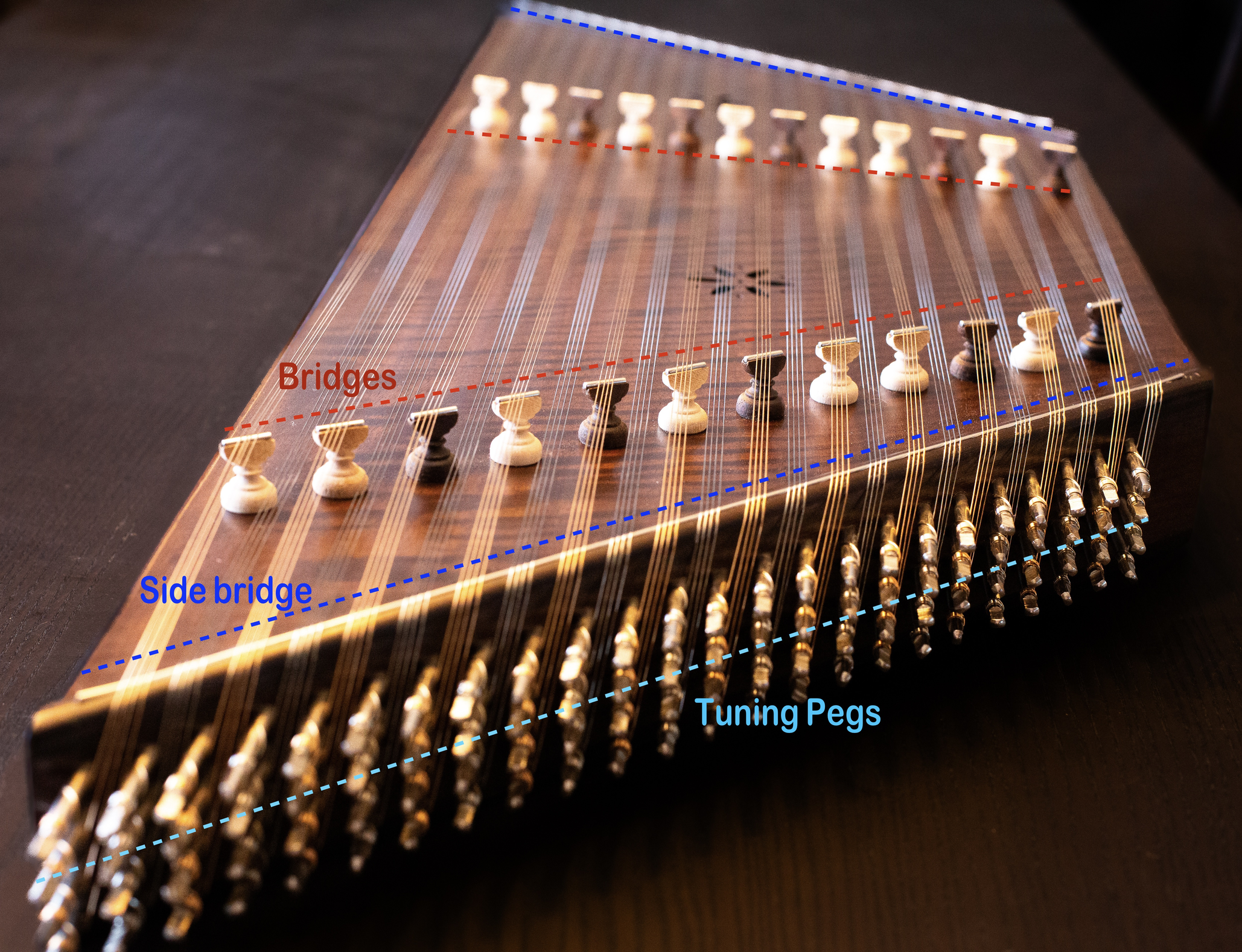 Each bridge features a small metal component over which the strings pass, avoiding penetration into the wooden bridge over time. Side bridges are also present on both sides. (Visible in the picture below). Each string is threaded through and around a tuning peg, with the other end having a knot to secure it to a small metal piece on the opposite side.