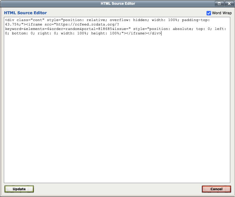 2. A plain text editor pops up. Copy and paste the HTML generated from the feed generator and click "update".