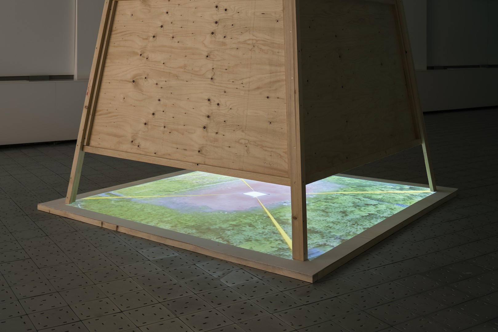 Čtveřice aktérů provedla první sondu. Ta spočívala v osazení bílé zpevněné plochy o rozloze 2,5 x 2,5 metru do středu antukového hřiště. Z rohů vzniklého čtverce pak pravidelně vypouštěla bílý, heliem plněný balon o průměru 2 m nesoucí na své spodní straně záznamové zařízení. Balon byl operovaný pomocí čtveřice tenkých žlutých lanek. Videoinstalace This side up zprostředkovává odpoutávání obrazu, vzlet a dočasný nadhled nad danou lokalitou. Kamera opakovaně opouští vymezenou plochu a nahlíží prostředí reziduální části města – opuštěného sportoviště z nadhledu 25 metrů. Aparát umožňující tento prožitek ve videu pouze tušíme, po celou dobu zůstává skrytý mimo zorný úhel pozorovatele. Exponovaní jsou naopak aktéři, určující choreografii pohybu obrazu, stejně jako spojnice čtyř kotvících lan, která vizuálně převrací perspektivu pozdějšího instalačního řešení ve výstavním prostoru. Na podlaze se nachází bílá čtvercová plocha, identická s původní použitou při natáčení. Tvoří základ, z nějž stoupá dřevěná konstrukce. Ta definuje jakýsi obal na videoprojekci a zároveň svým vertikálním, pyramidálně se zužujícím tvarem vyzývá diváka k pohledu vzhůru, kam původně směřovala i vypouštěná video-sonda. Videozáznam situace je instalačním řešením do značné míry potlačen. Projekce se uskutečňuje uvnitř pláště a čtení promítaného obrazu je možné pouze ve spodní části instalace. Tam dopadá na bílou základnu a díky odsazené ploše konstrukčního pláště je viditelný při odstupu ve spodním průhledu. Tato situace může zpětně evokovat nahlížení za stavební oplocení.