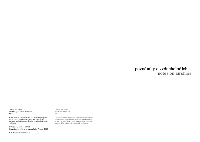 Publikace Poznámky o vzducholodích vznikla jako doprovodný katalog stejnojmenné výstavy konané v Krajské galerii výtvarného umění ve Zlíně v roce 2017. Její strukturu tvoří obrazová dokumentace instalace a vystavených prací, ale také chronologicky uspořádaný výběr starších realizací. Jejich společným jmenovatelem je zepelín – ztužená vzducholoď, respektive její historicky zažitý obraz a s ním spojené asociace. Jednotlivé práce se k tomuto obrazu vztahují a skrze rozličné fragmenty ho rekonstruují a znovuobjevují. Vzducholoď tak slouží jako symbol – objekt odkazující k ideji, ale i limitům jejího naplnění.
