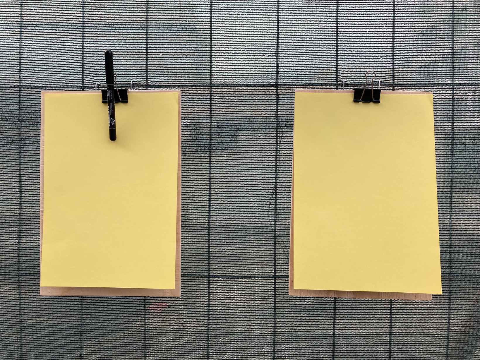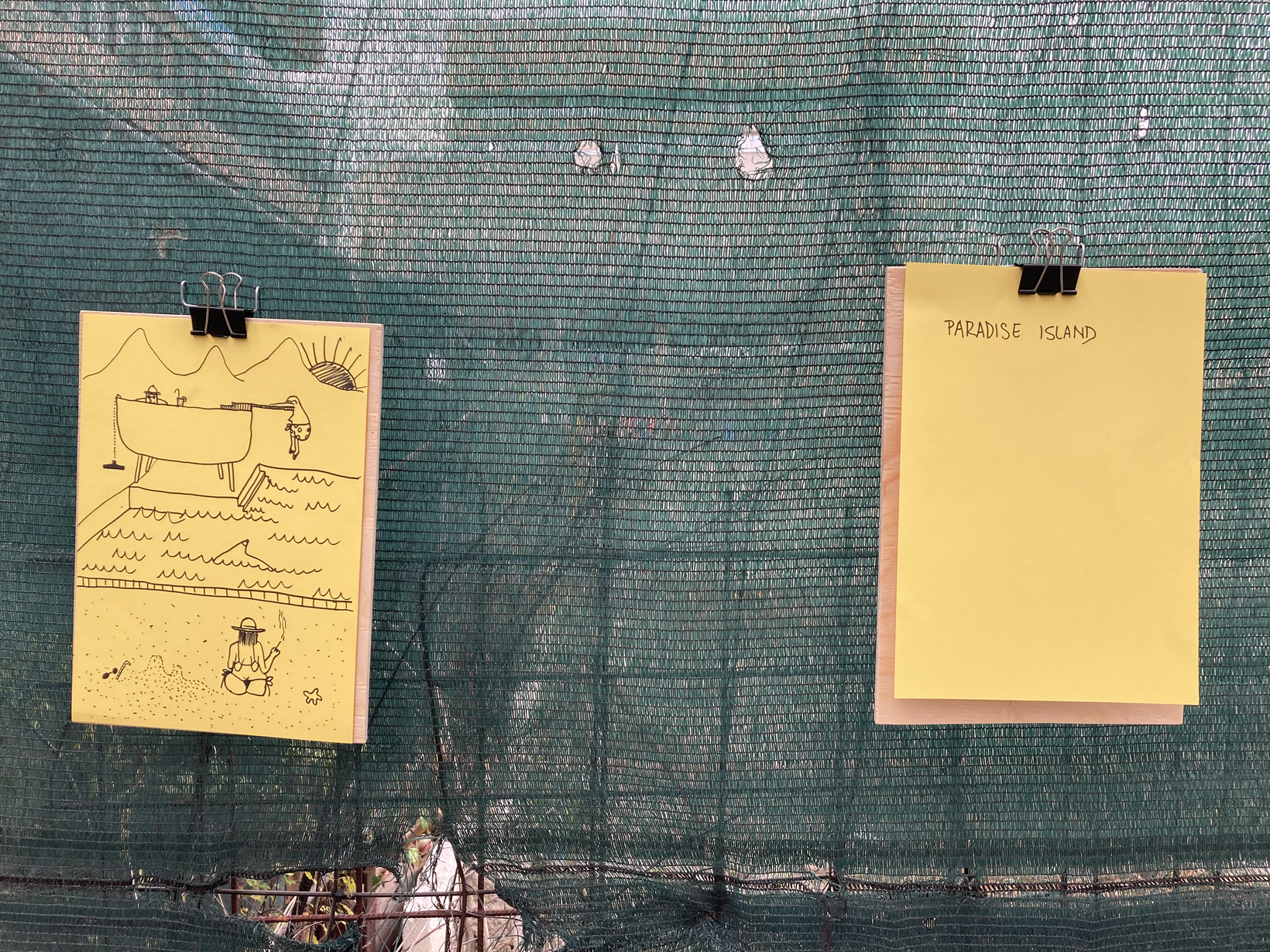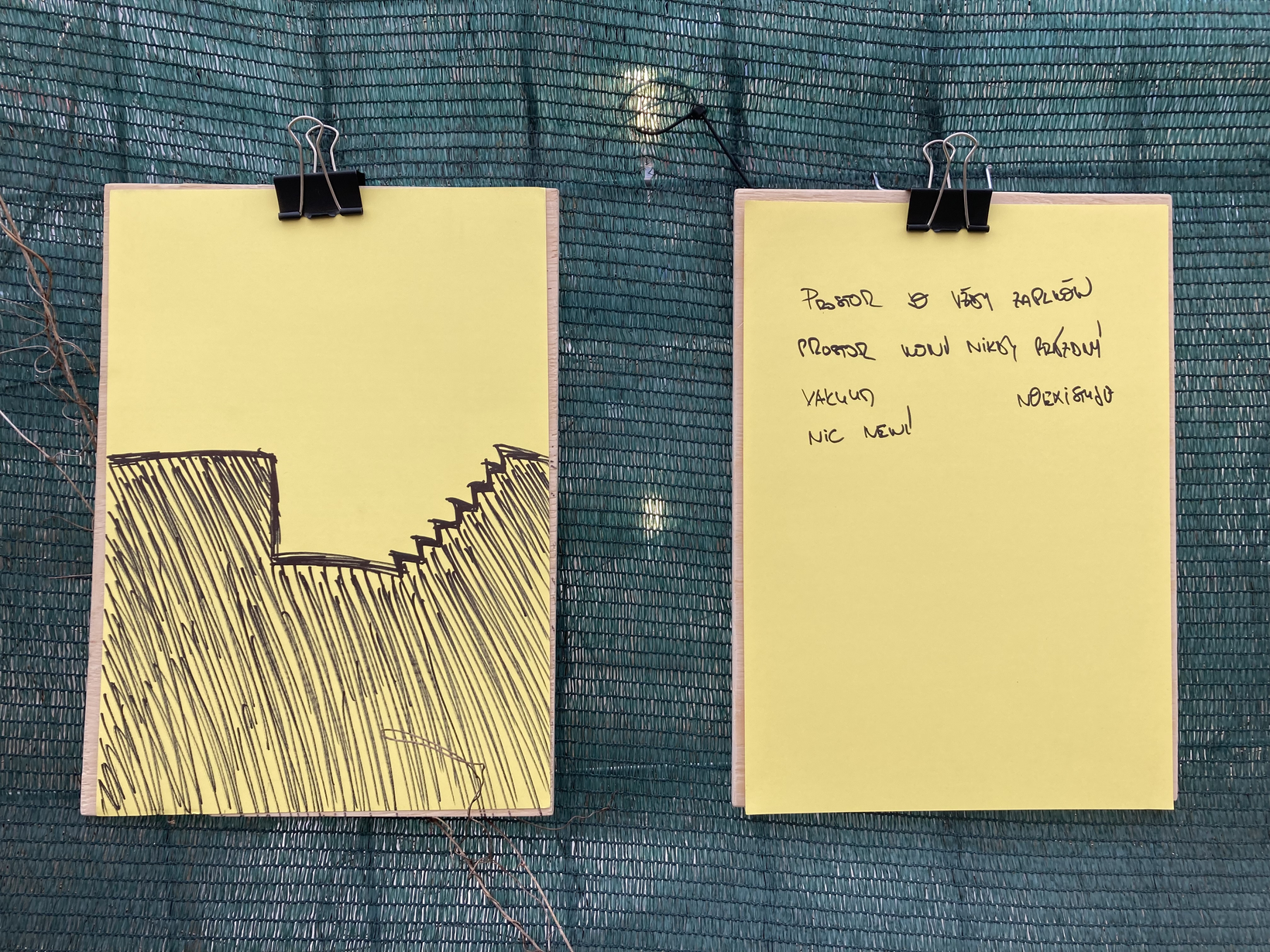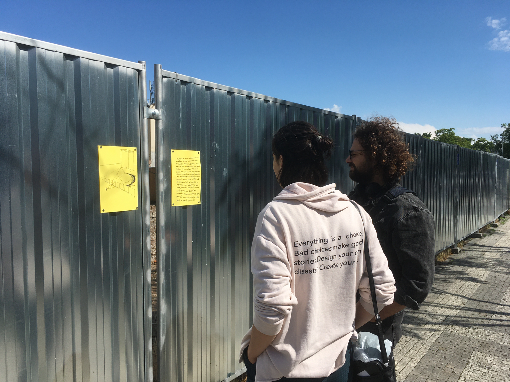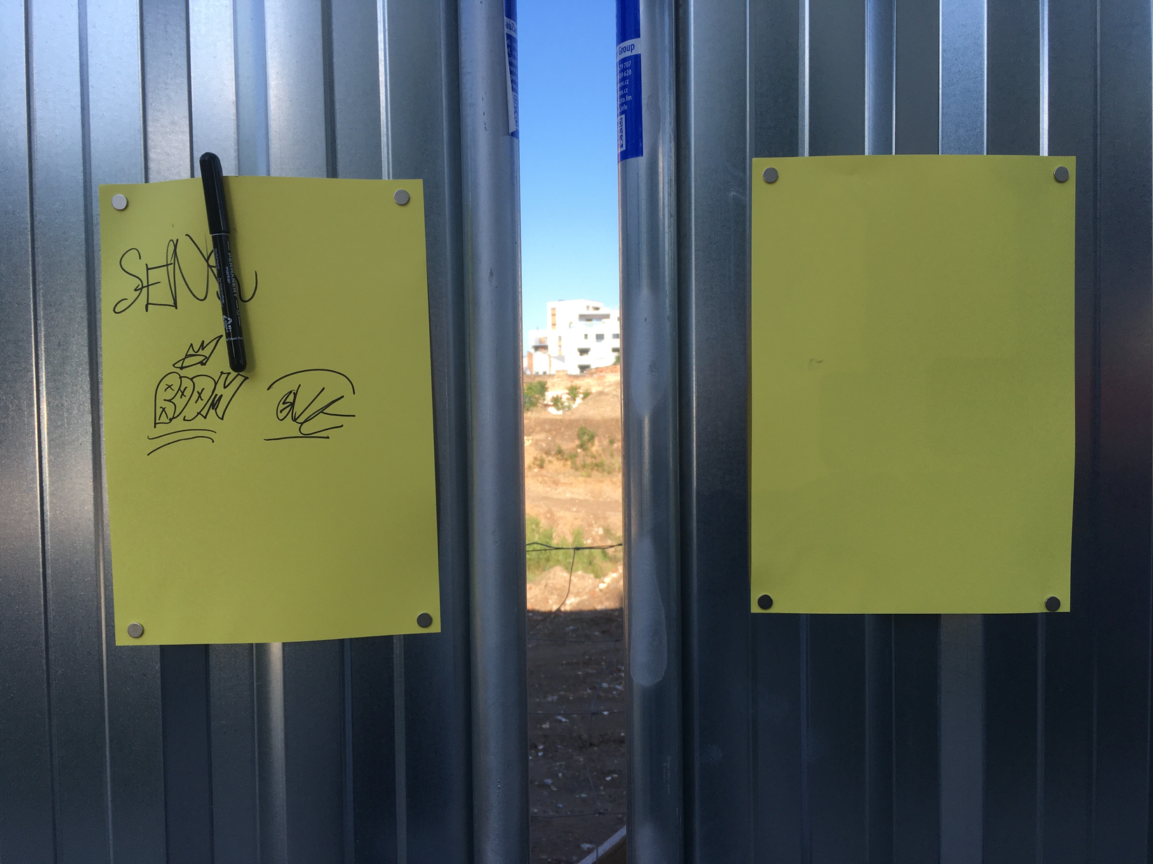 Pevné plochy stavebního oplocení vytváří vizuální bariéru. Do prostoru za nimi vidíme pouze úzkou mezerou mezi jednotlivými dílci. Stavební zábrana poslouží jako opora pro psaní. Soustředíme se na situaci, ve které se nacházíme a přemýšlíme o dispozicích a kvalitách svého bezprostředního okolí. Tato představa je v krátkém čase zaznamenána na list papíru jako spontánní komentář: