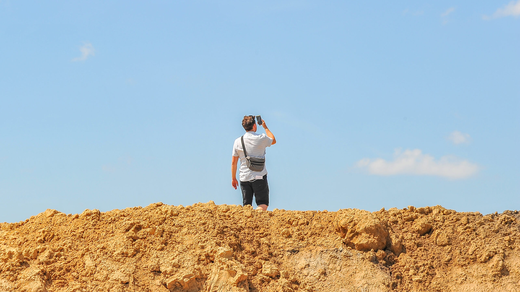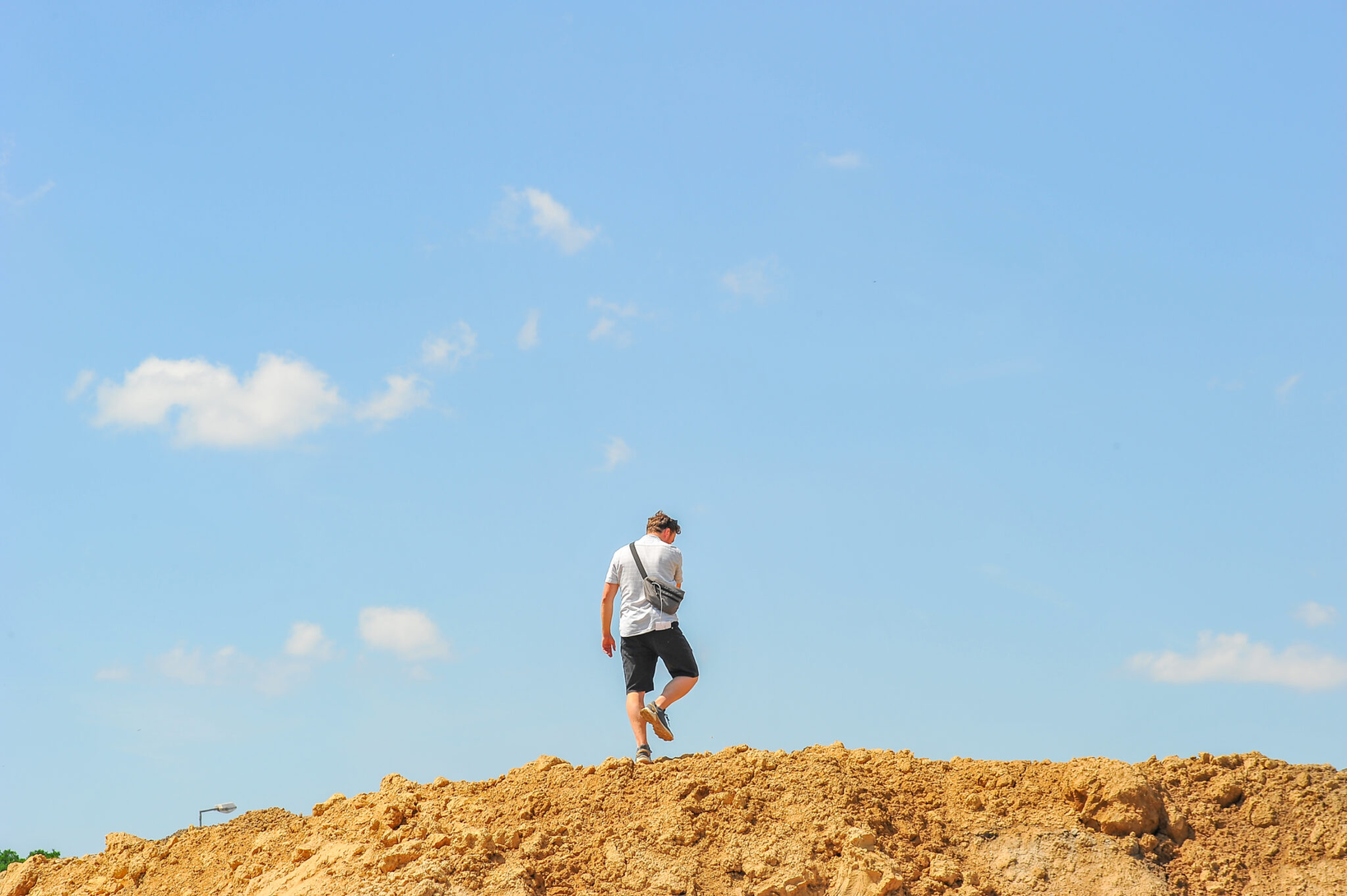 Pohled shora na opuštěnou stavební jámu je zcela statický a klidný.  Základy zahloubené pod úroveň okolního terénu mají tvar dlouhého obdélníku, rozděleného na dvě poloviny, přičemž jedna je zatopena vodou, druhá vyjevuje suchou betonovou plochu. V prostředí sevřeném pažením výkopové jámy se pohybuje postava pozorovaná z absolutního nadhledu. Pomalou chůzí donekonečna obkružuje definovaný prostor, přičemž jedna polovina trajektorie vždy vede skrze vodní plochu. Zvuky kroků navrací dystopickému prostředí díry lidské měřítko.