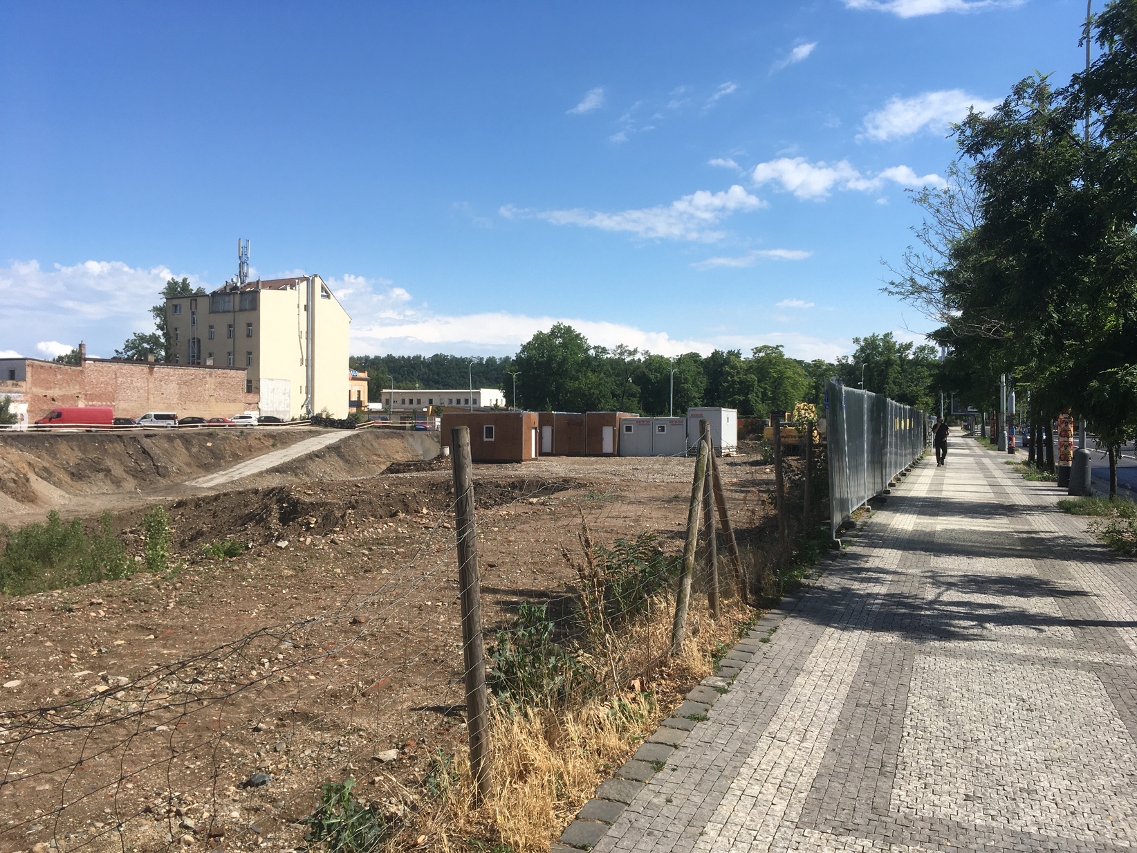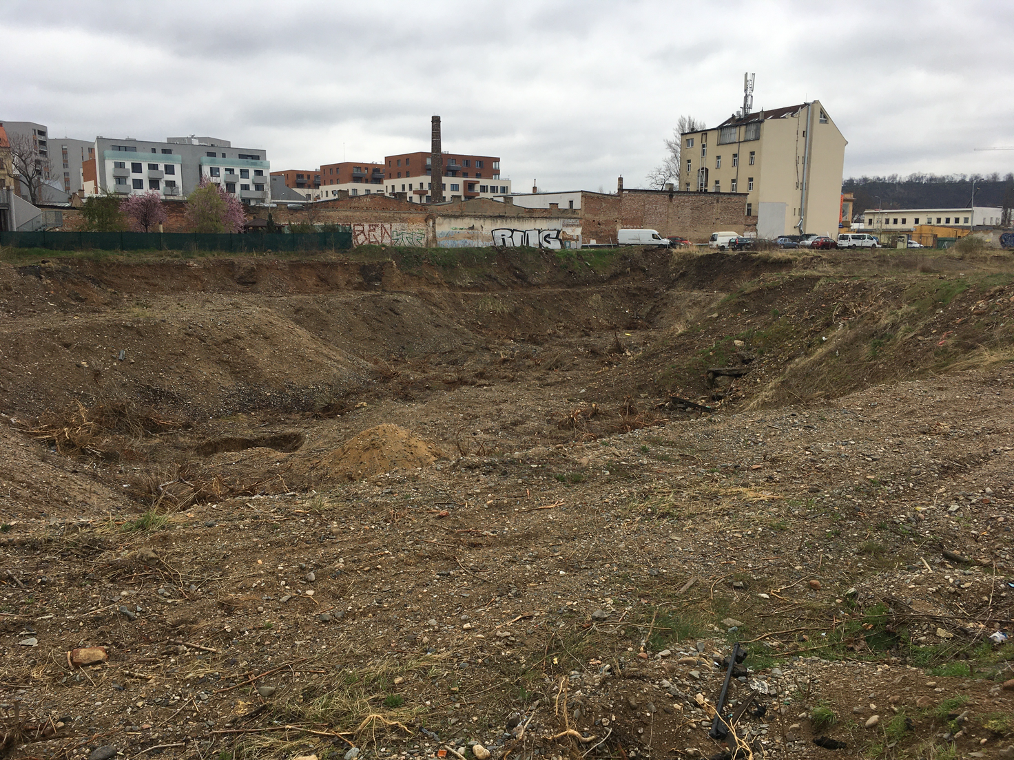 Stavební pozemek mezi ulicemi Jateční, Tusarova a Komunardů, Praha 7 - Holešovice. (Původně továrna lučebních výrobků a barev,  v současnosti staveniště bytového komplexu Linea Pura.)