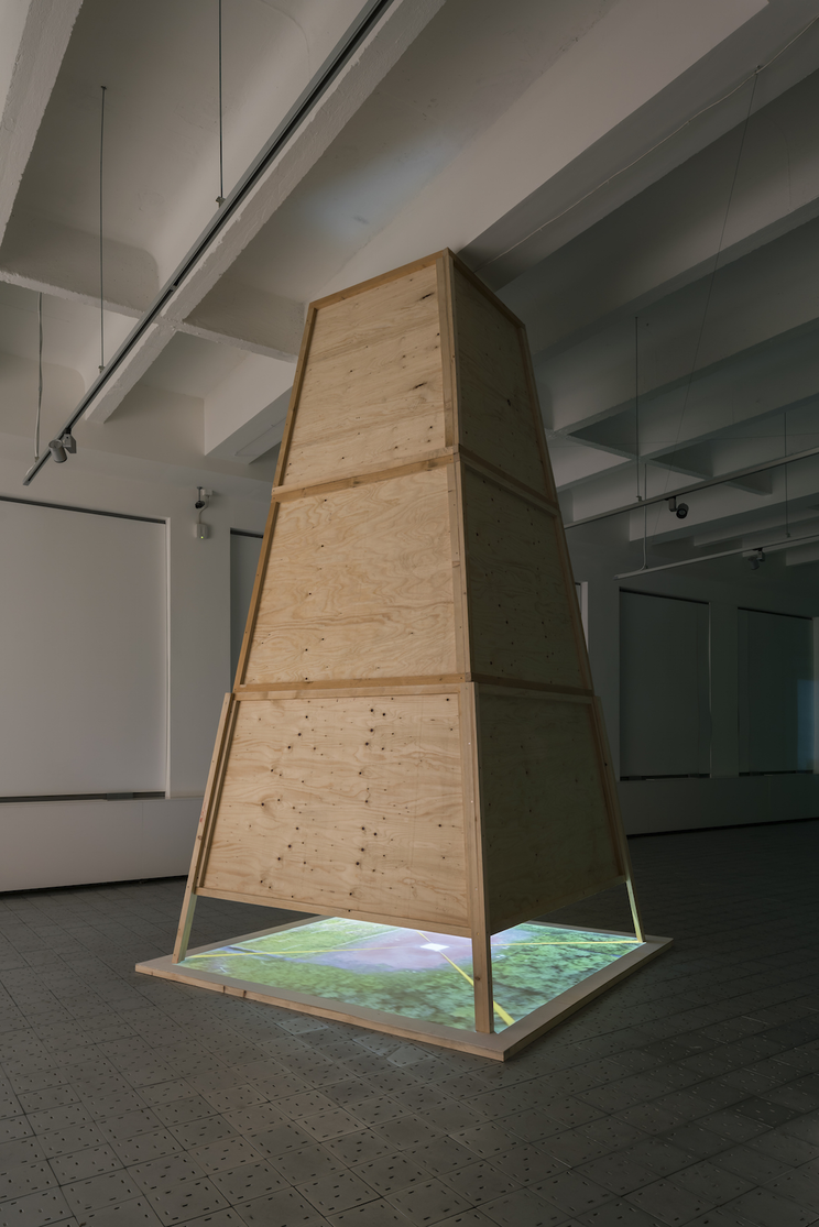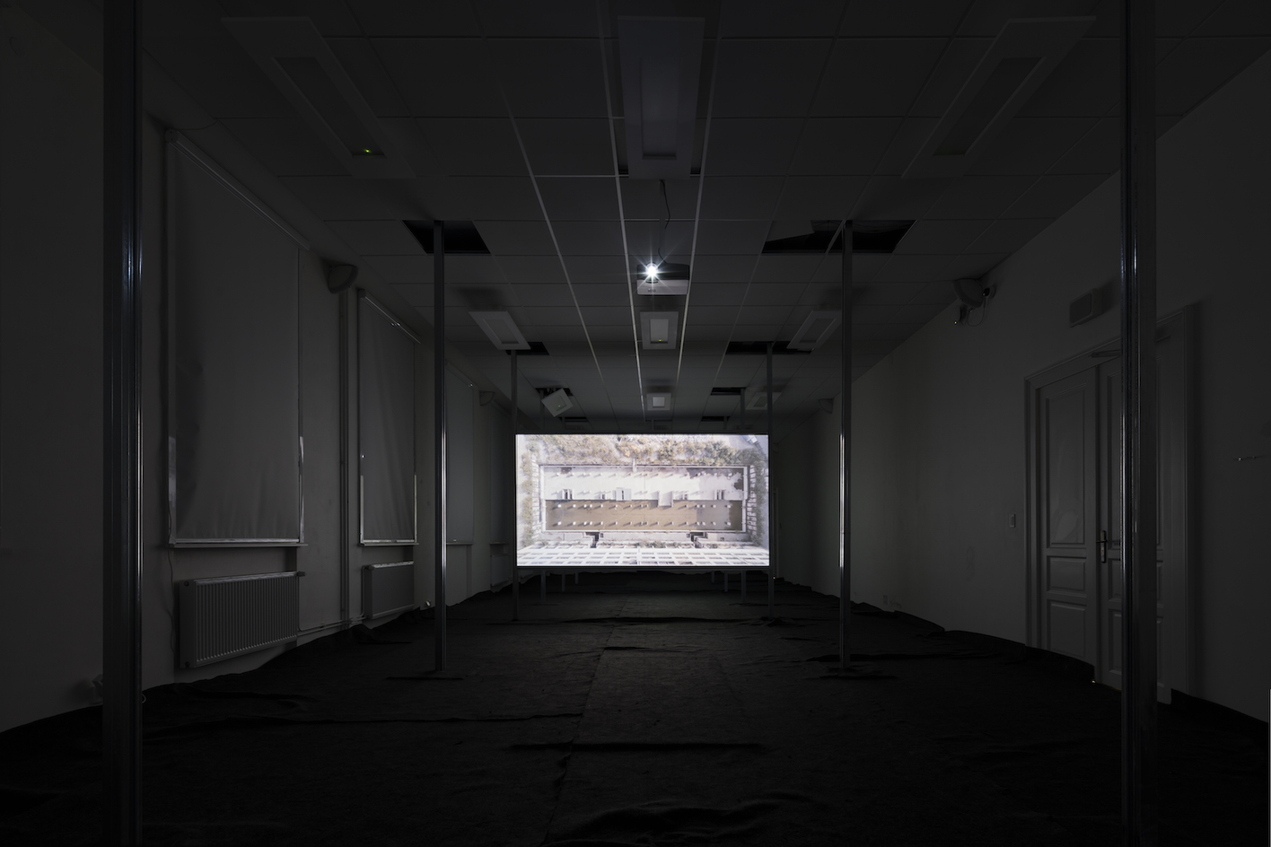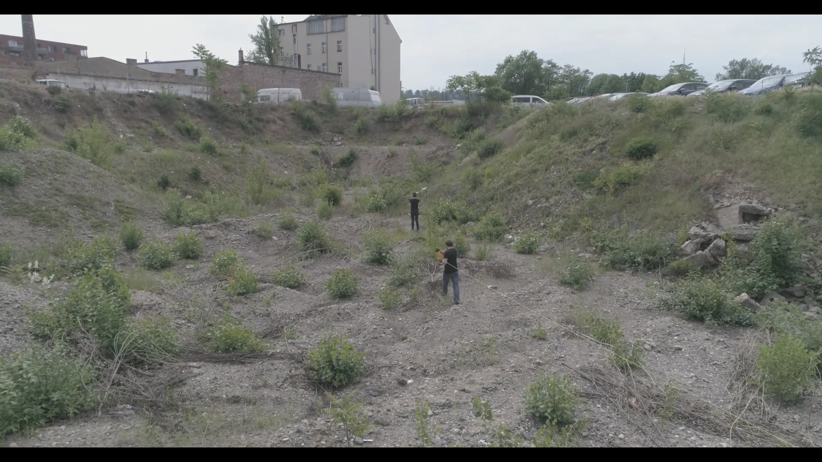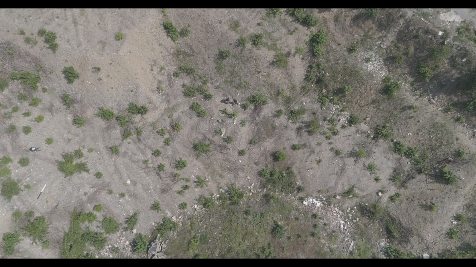 Dron opakovaně prolétá skrz nedostavěný skelet. Horizontální záběr v průměrné výšce očí zaznamenává prázdný interiér železobetonové konstrukce s vegetačním podrostem. Plynulý lineární pohyb vytváří dojem zdánlivě nekonečného opakování, když i jediná překážka v jeho trajektorii – mladý stromek rostoucí v cestě – se před pohledem letící kamery odklání stranou.