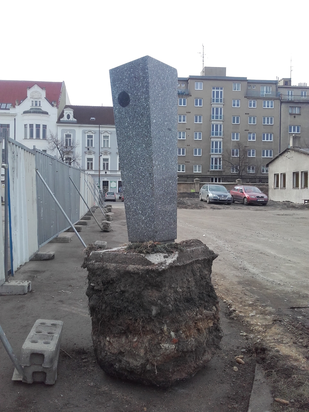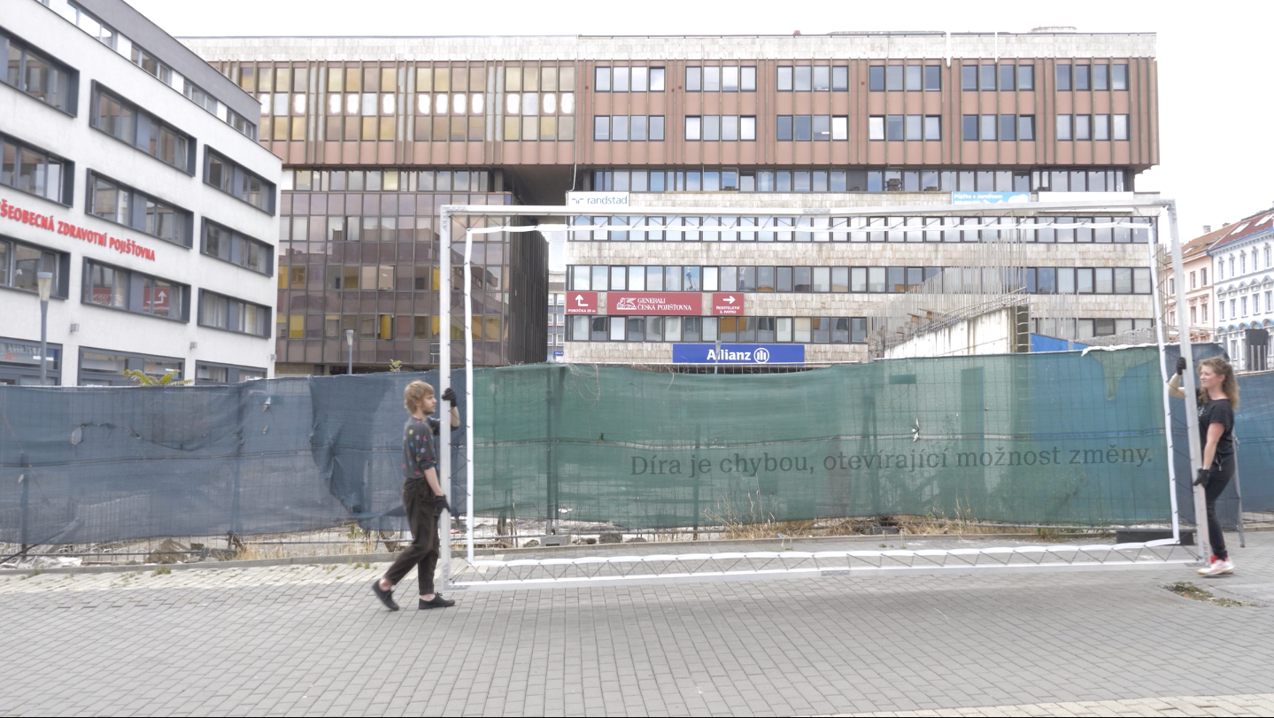 anotace pozvánky: Tomáš Moravec rozvádí ve své výstavě pro Galerii 2 Domu umění úvahy o městských „dírách”, prostorech, jenž uvízly v čase v přechodné fázi na cestě k zamýšlenému účelu a ohledává tato místa neotřelým pohledem. Happening na Mírovém náměstí u nedokončené stavby pod Krajským úřadem reaguje na potenciál otevírající se v nedokončenosti a dočasnosti tohoto prostoru.