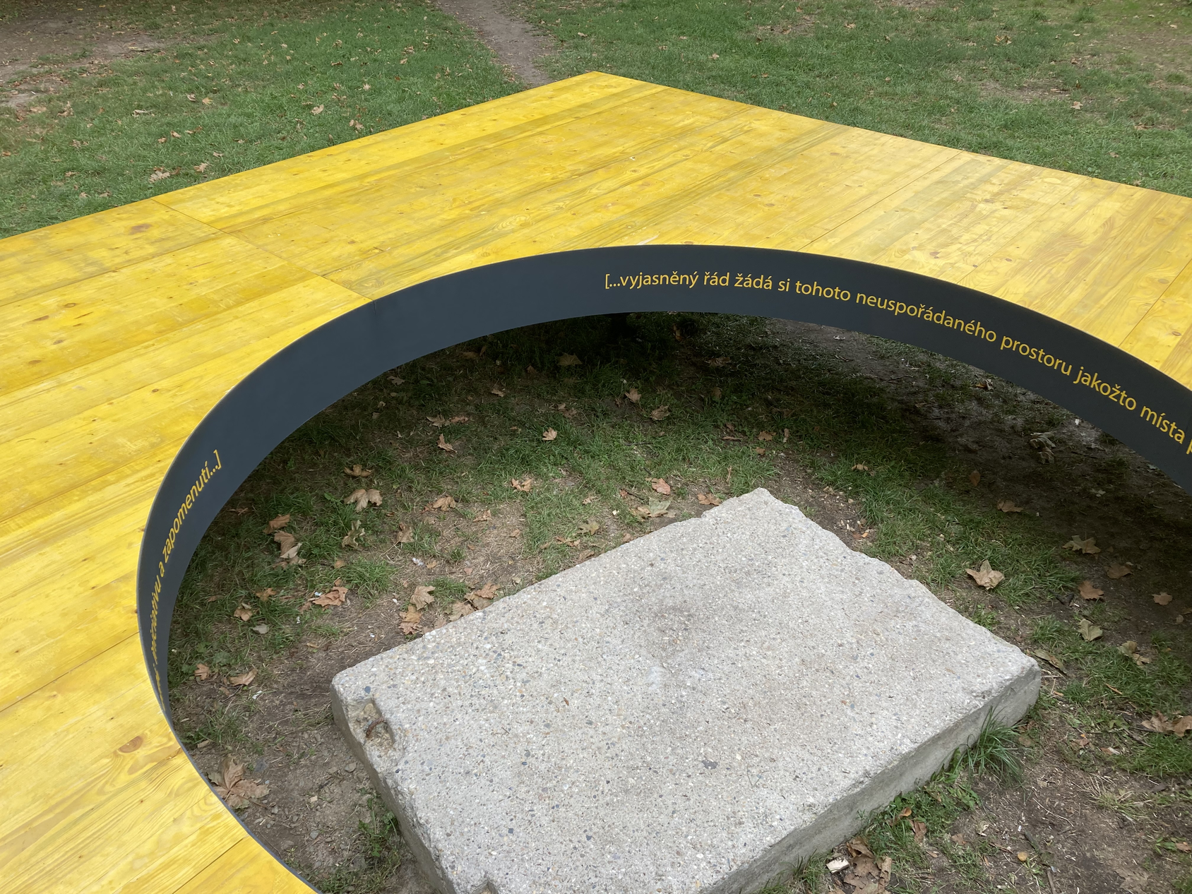 Instalace Plocha byla osazena nad nalezeným reziduem, pohozeným kusem stavebního panelu, který se v místě po několik let nacházel. Na vnitřní hraně díry instalace byl uveden úryvek textu Rudolfa Schwarze, který se stal i mottem této disertační práce: