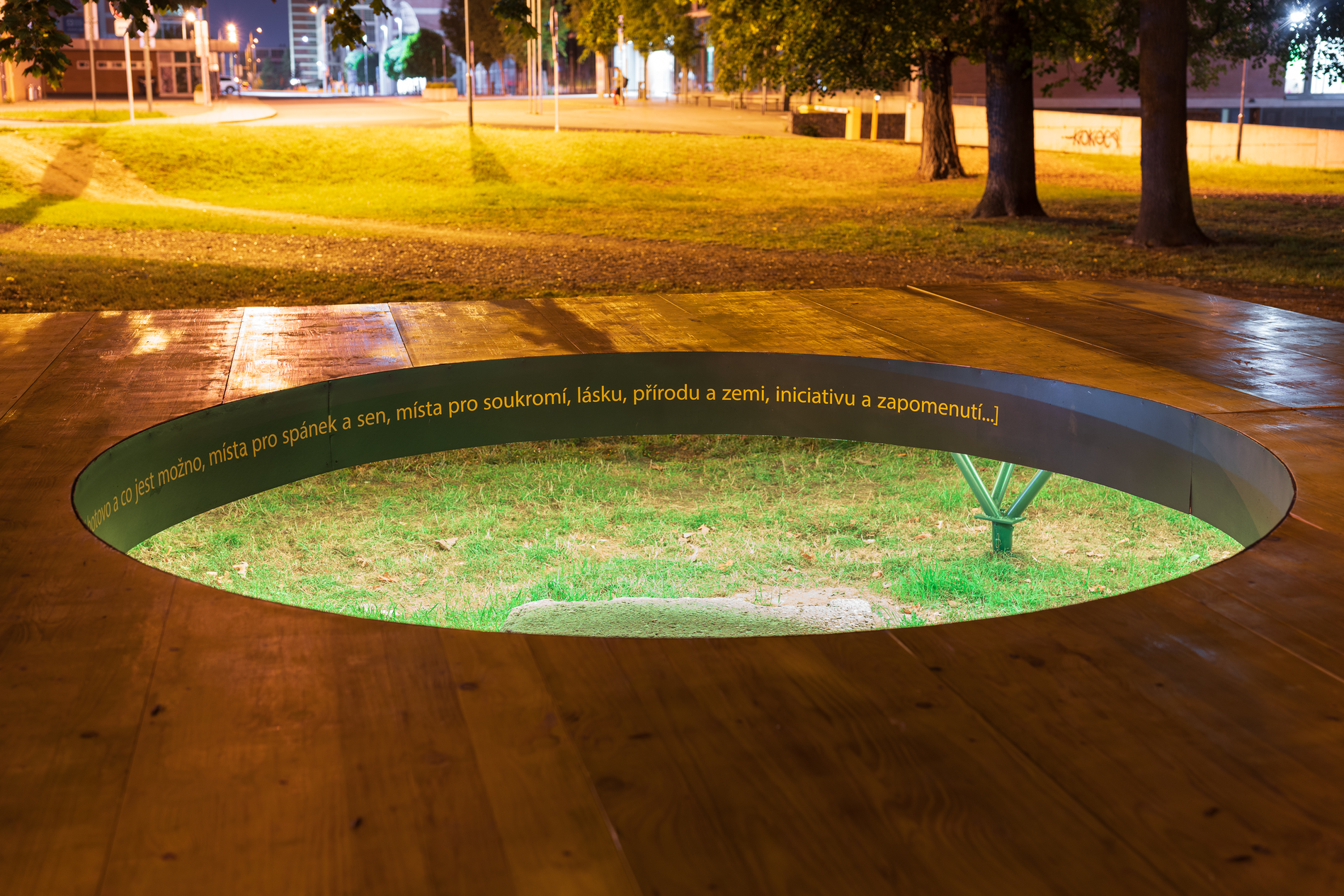 [...Prostředí současných měst čelí stále zesilujícím tlakům a snahám o maximální vytěžení a ekonomicko-politické zužitkování. Výslednicí těchto procesů se stává předem kolonizovaný prostor, v jehož náručí se máme cítit pohodlně pouze tehdy, pokud najdeme adekvátní uplatnění našich tužeb, pohybů a zamýšlených cílů v soukolí systémového mechanismu. Nastíněná dystopická vize prostředí, v němž je nemožné nadále vykonávat jakákoliv svobodná gesta a využívat veřejný prostor k poetickým aktivitám, je možná, pokud jí jako občanská společnost nevyvrátíme...]