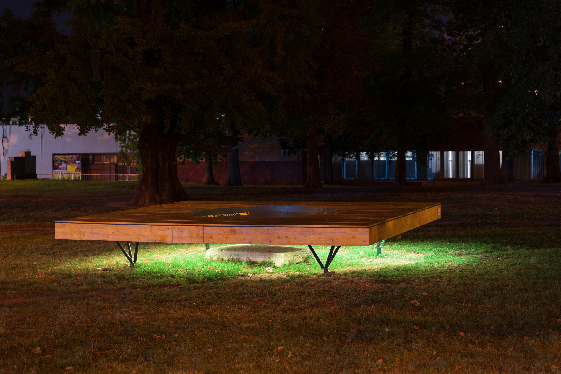 Postupně se hrdlo kráteru zmenšovalo naváženou zeminou, ale ve svém středu se pokaždé propadlo. Očekávání zasypané díry tak bylo s každou další tunou materiálu vzdáleno víc a víc výchozí představě. Jako by roky exponované jámy zanechaly hlad po materiálu, hlad, který neutuchal ani po několikaměsíční úmorné logistice stavební techniky. Okraj kráteru však byl paradoxně čím dál pevnější, až poskytoval pocit bezpečí i na svém okraji, uprostřed zarovnaného prostoru. Nově vzniklý tvar, kruhová jáma uprostřed, poskytovala pohodlné sezení, přestože nohy jejích uživatelů visely dolů do temné hlubiny jámy.