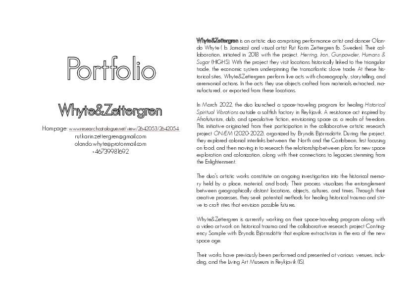 Whyte&Zettergren is an artistic duo comprising Jamaican dancer Olando Whyte and Swedish visual artist Rut Karin Zettergren. Their collaboration, initiated in 2018 with the project, Herring, Iron, Gunpowder, Humans & Sugar (HIGHS). With the project they visit locations historically linked to the triangular trade, the economic system underpinning the transatlantic slave trade. At these historical sites, Whyte&Zettergren perform live acts with choreography, storytelling, and ceremonial actions. In the acts they use objects crafted from materials extracted, manufactured, or exported from these locations.