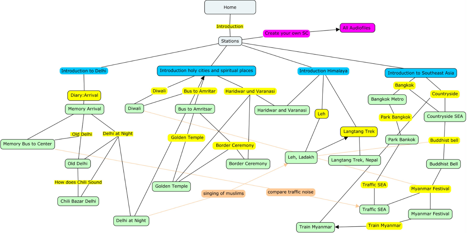 Listening and traveling in concurrence have always been a big tour of discovery with new and unknown, curious, and often very humorous sounds and situations. The website allows people to explore, while reading, listening, and thinking about atmospheres and sound for themselves. Users can take a sound travel of their own experience. The website can also be used to add visitors' own travel experiences and memories. It should become a network of different texts and approaches to describe sound memories. My individual memory should become a cultural (Halbwachs 1980) or collective (Assman 2006) memory. The “memory of the community” can be a basis for new approaches in sound studies as well as cultural and historical investigations.