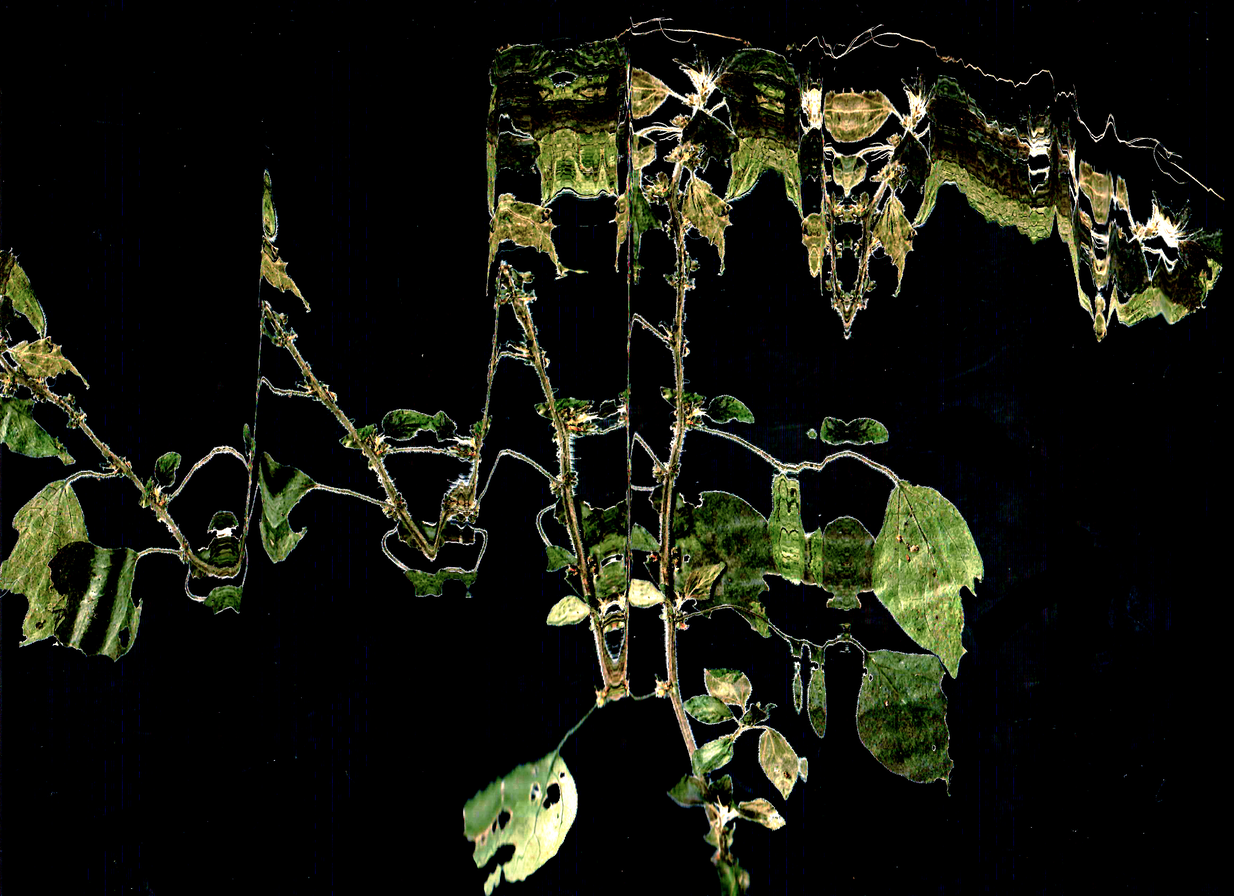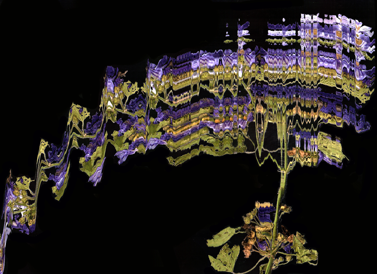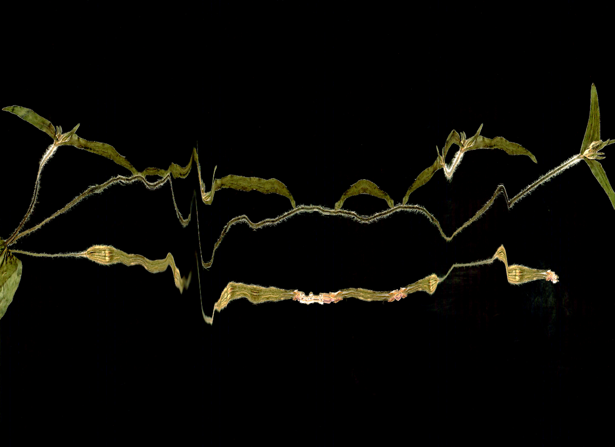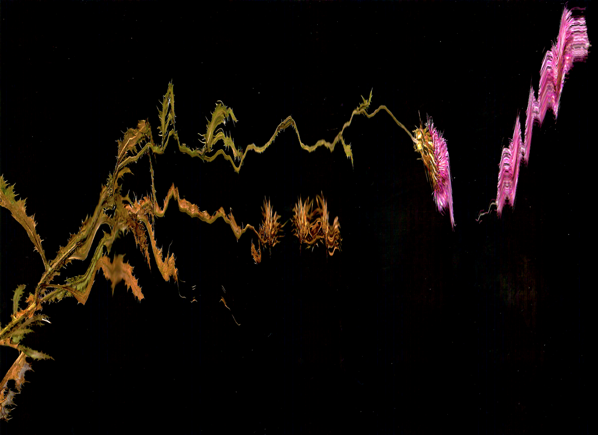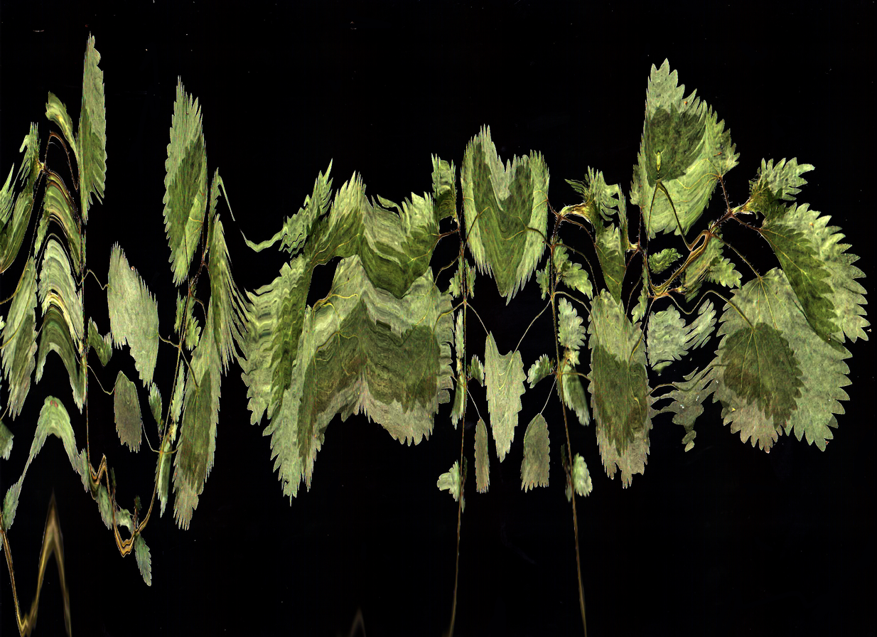 I scanned the collected weeds in motion, which caused a deformation of their original shape, generating abstract patterns, which appear to vibrate.