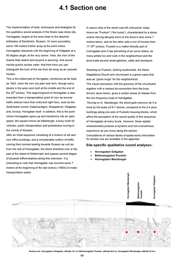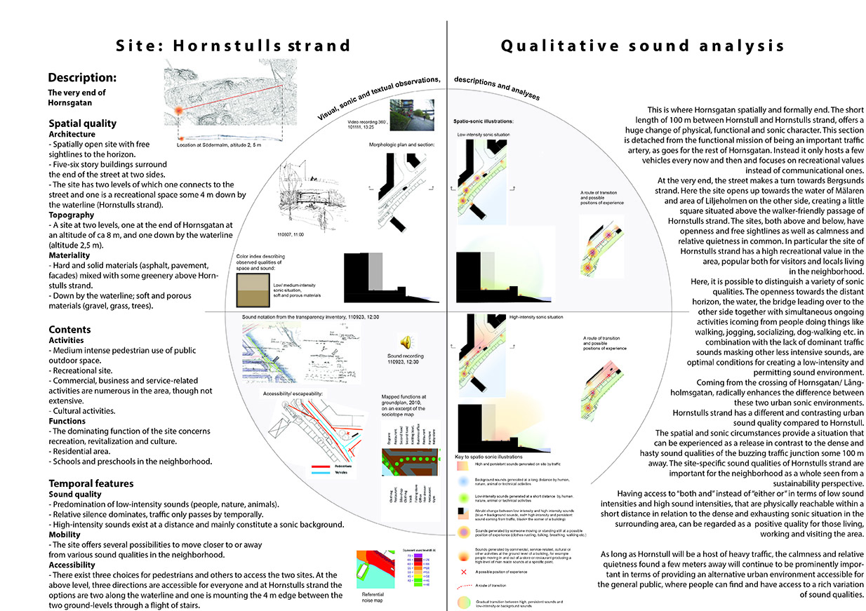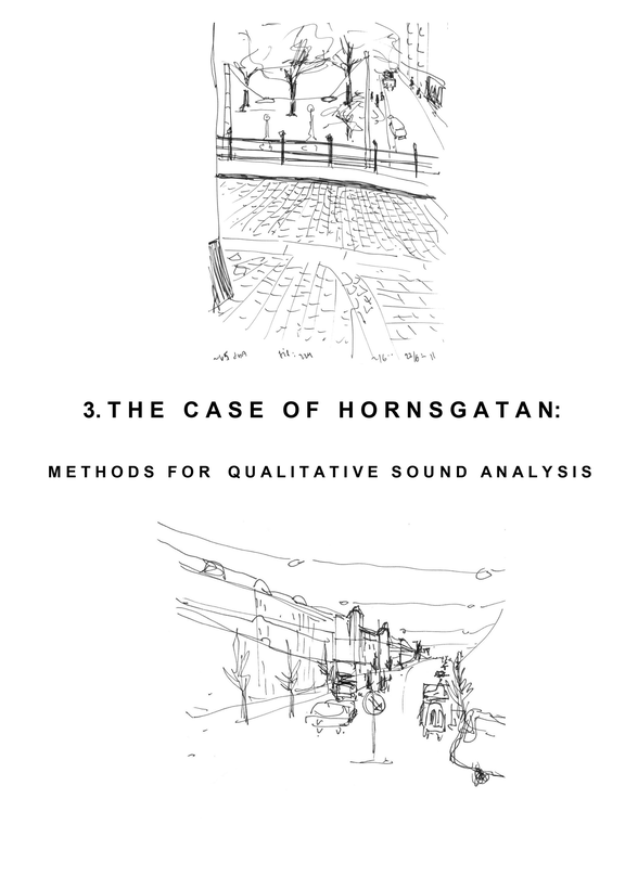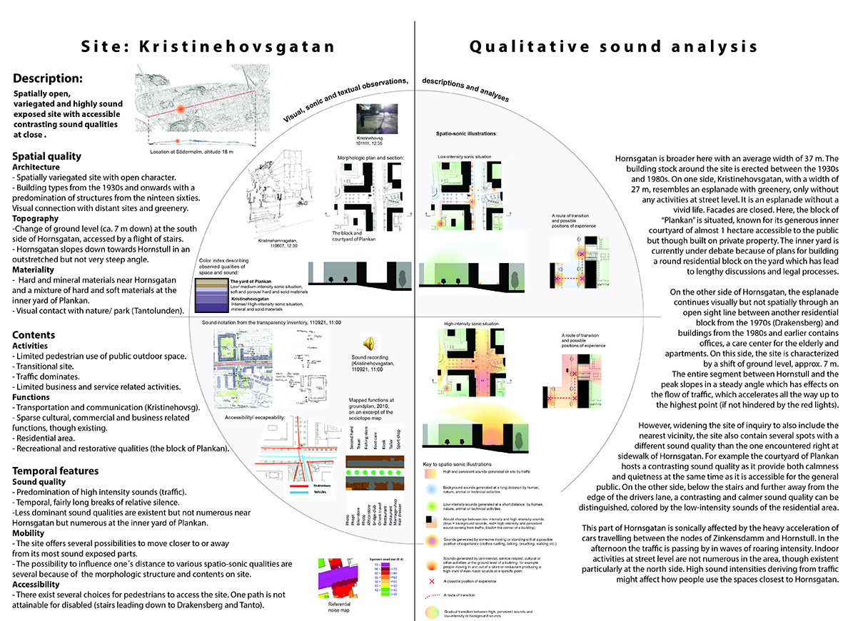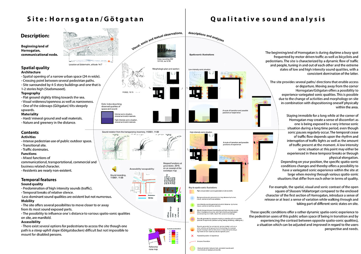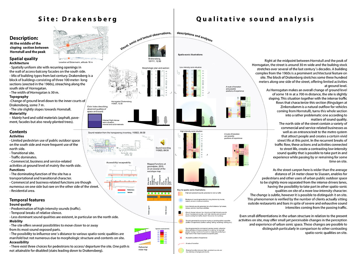 The licentiate thesis has its foundation in the analogue and well-recognized tool-box of the architect, such as various forms of documentation and sketching techniques, mapping, inventory and site-analysis, etc., when exploring tools and strategies for the communication and analysis of the exterior urban sound environment along the long and busy street Hornsgatan in Stockholm.