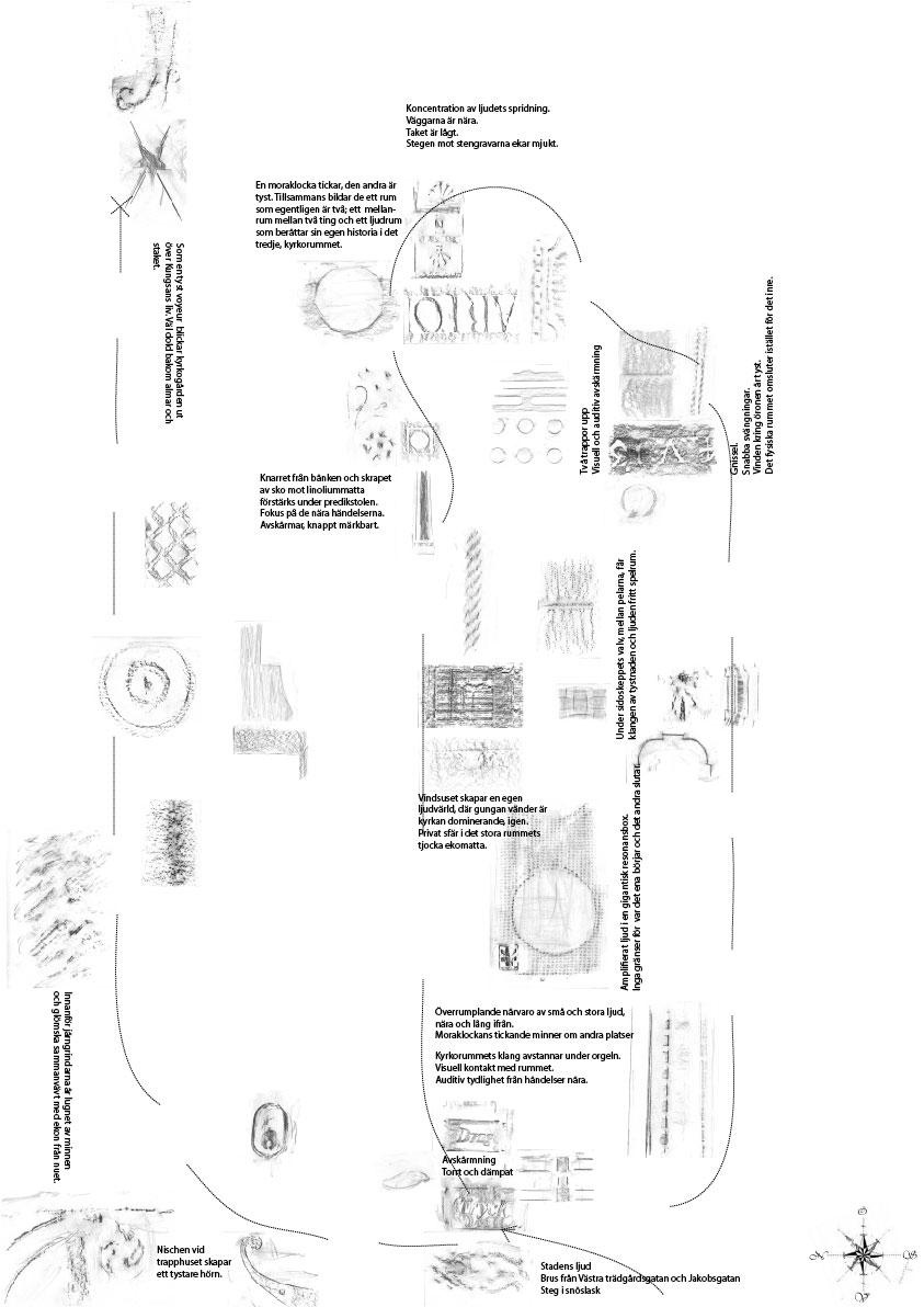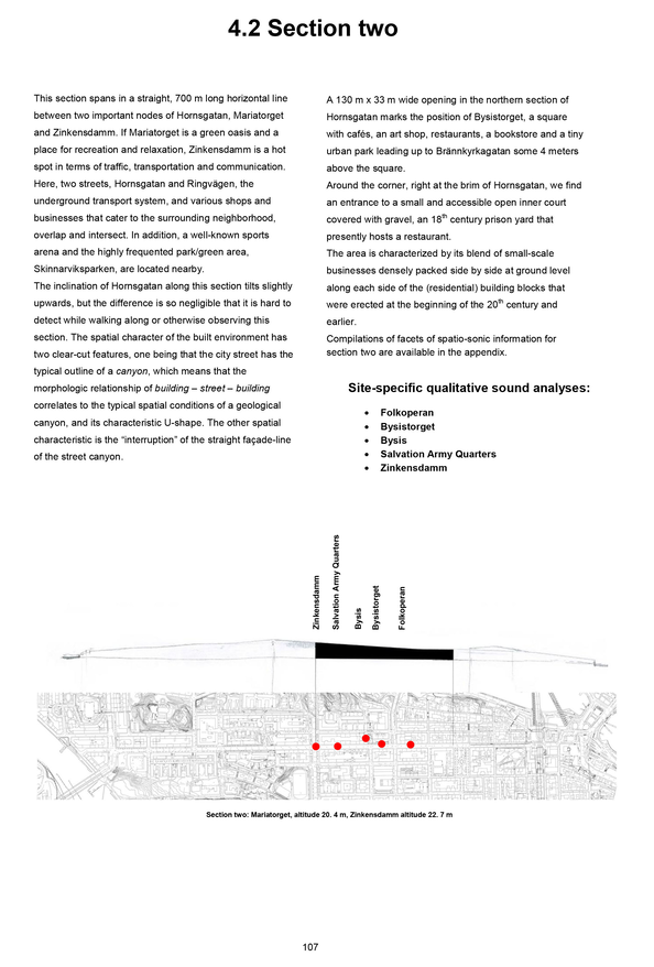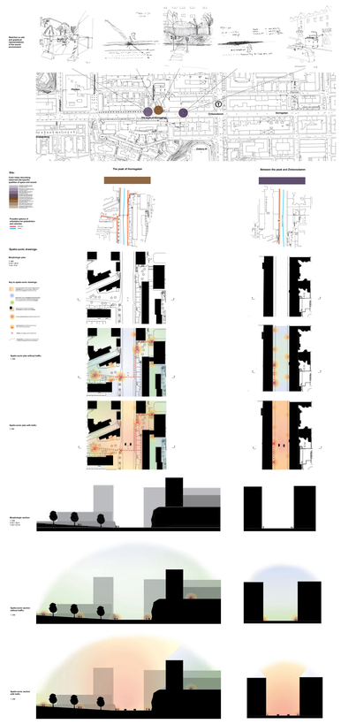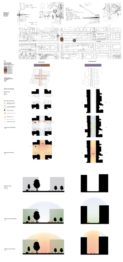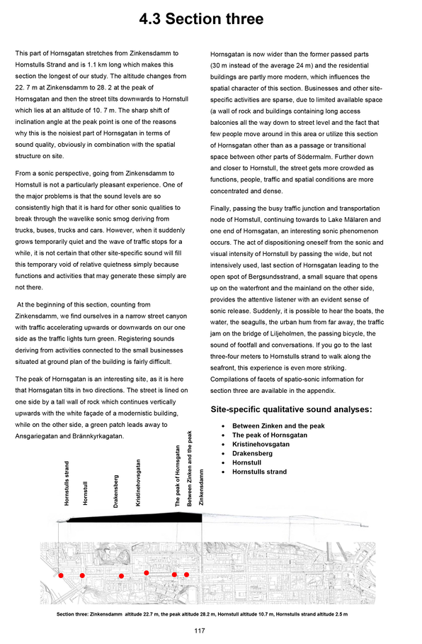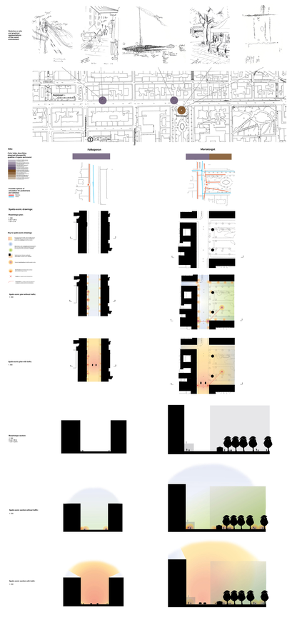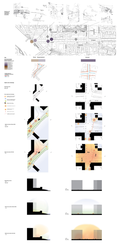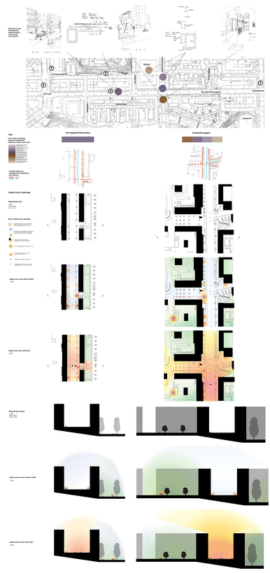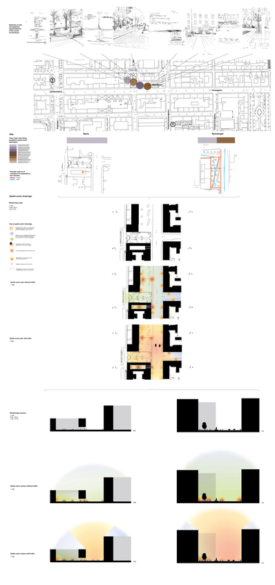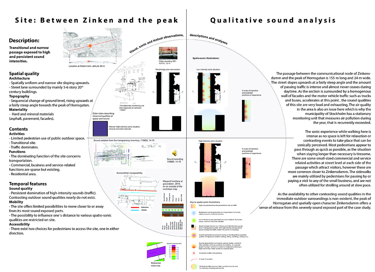 The licentiate thesis has its foundation in the analogue and well-recognized tool-box of the architect, such as various forms of documentation and sketching techniques, mapping, inventory and site-analysis, etc., when exploring tools and strategies for the communication and analysis of the exterior urban sound environment along the long and busy street Hornsgatan in Stockholm.