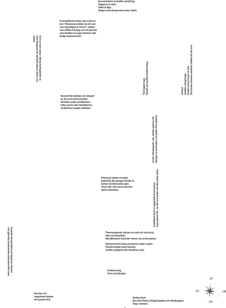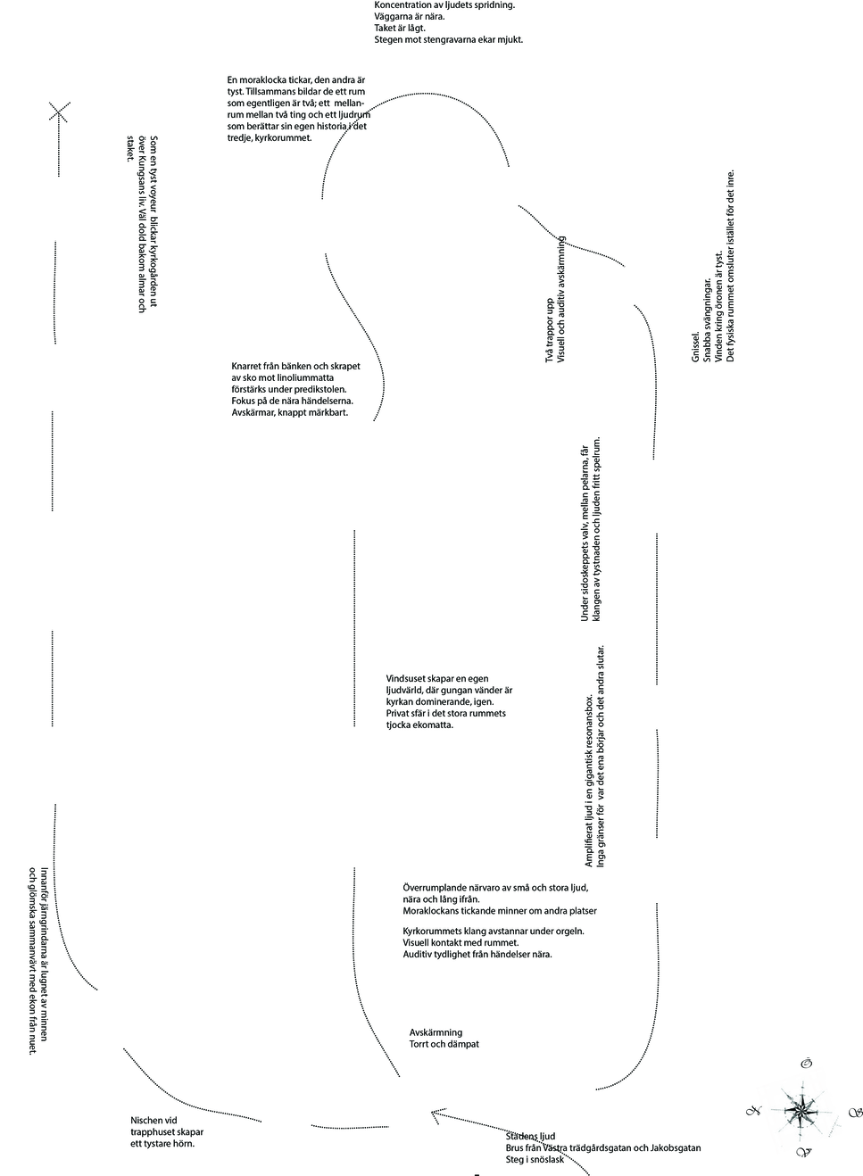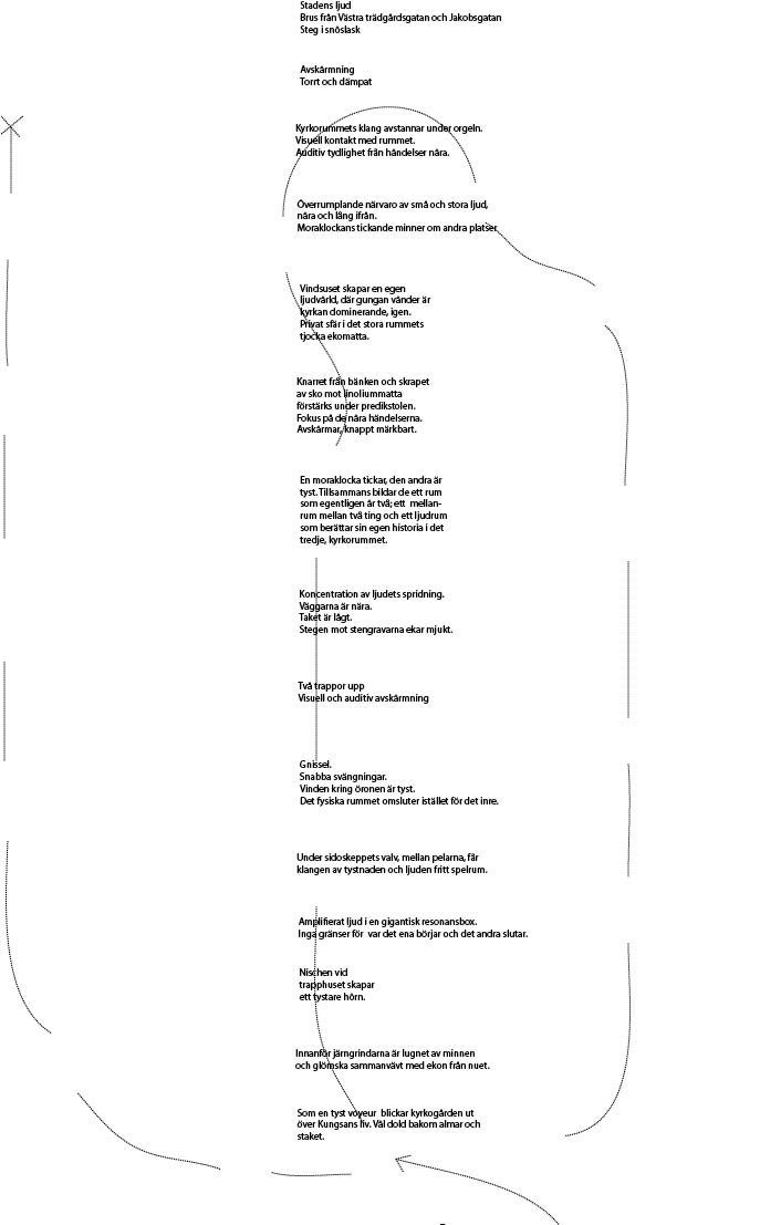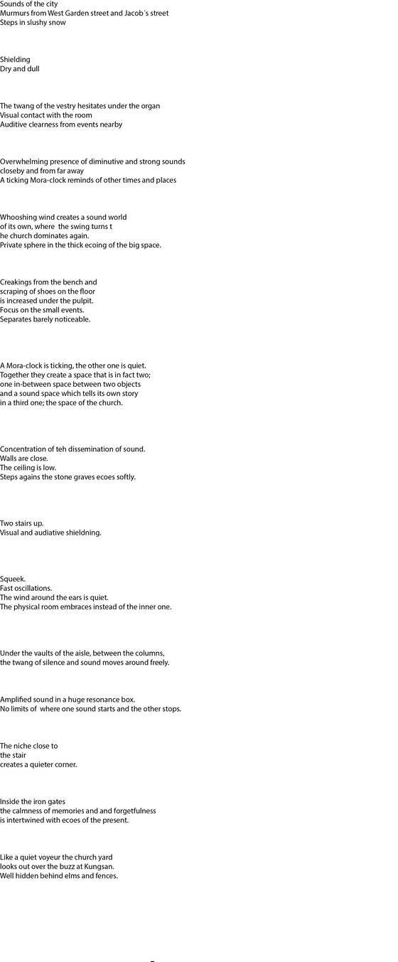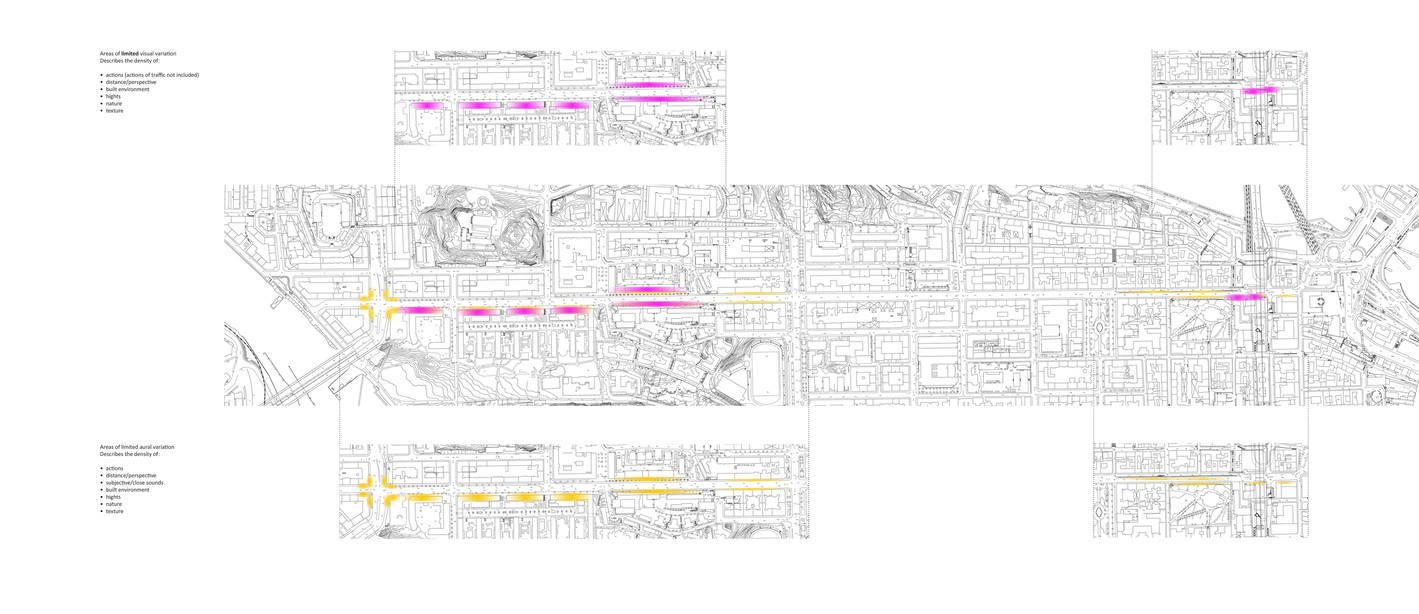 The licentiate thesis has its foundation in the analogue and well-recognized tool-box of the architect, such as various forms of documentation and sketching techniques, mapping, inventory and site-analysis, etc., when exploring tools and strategies for the communication and analysis of the exterior urban sound environment along the long and busy street Hornsgatan in Stockholm.