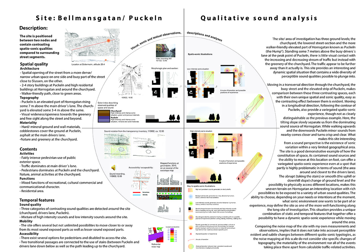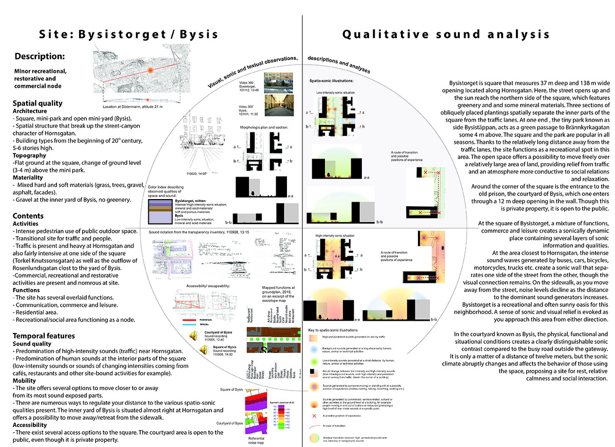 Sound in the city is an intricate phenomenon that affects us at several levels, both health-wise and socially. At the same time, sound has cultural and functional implications by mediating important information connected to identity, security and spatial orientation. Unfortunately, current quantitative methods are not sufficient for describing, analyzing and managing urban sounds in regard to this complexity. Complementary methods of representation and analysis need to be developed that will bring out important information - gathering it and making it visual - about the constitution, character and quality of urban sonic space that is possible to utilize alongside today’s calculation and measurement-based methods within such areas as architecture and urban planning practices.