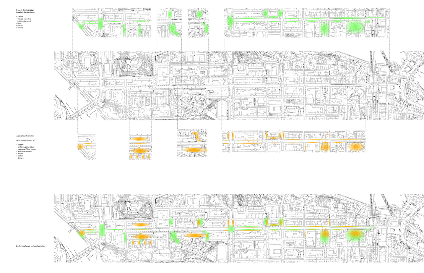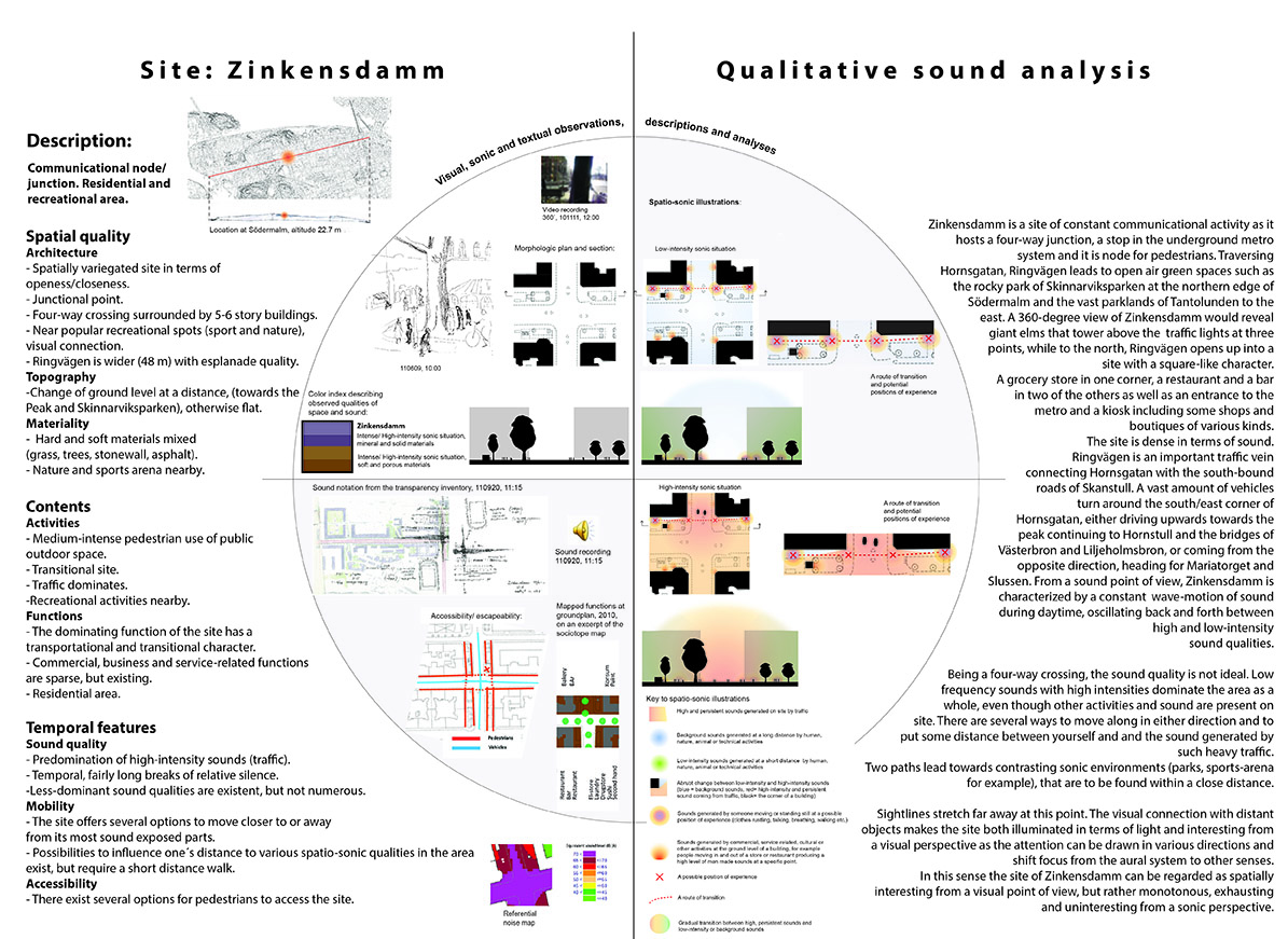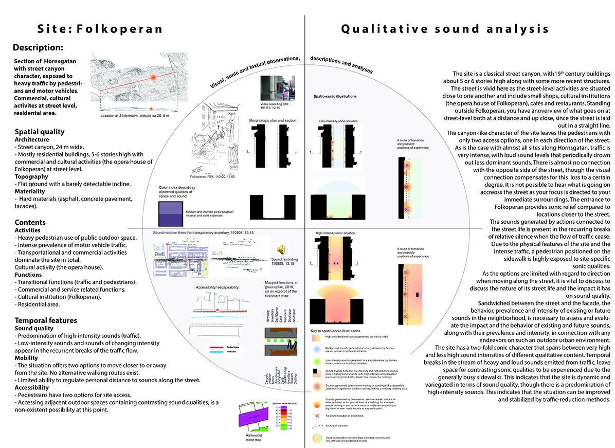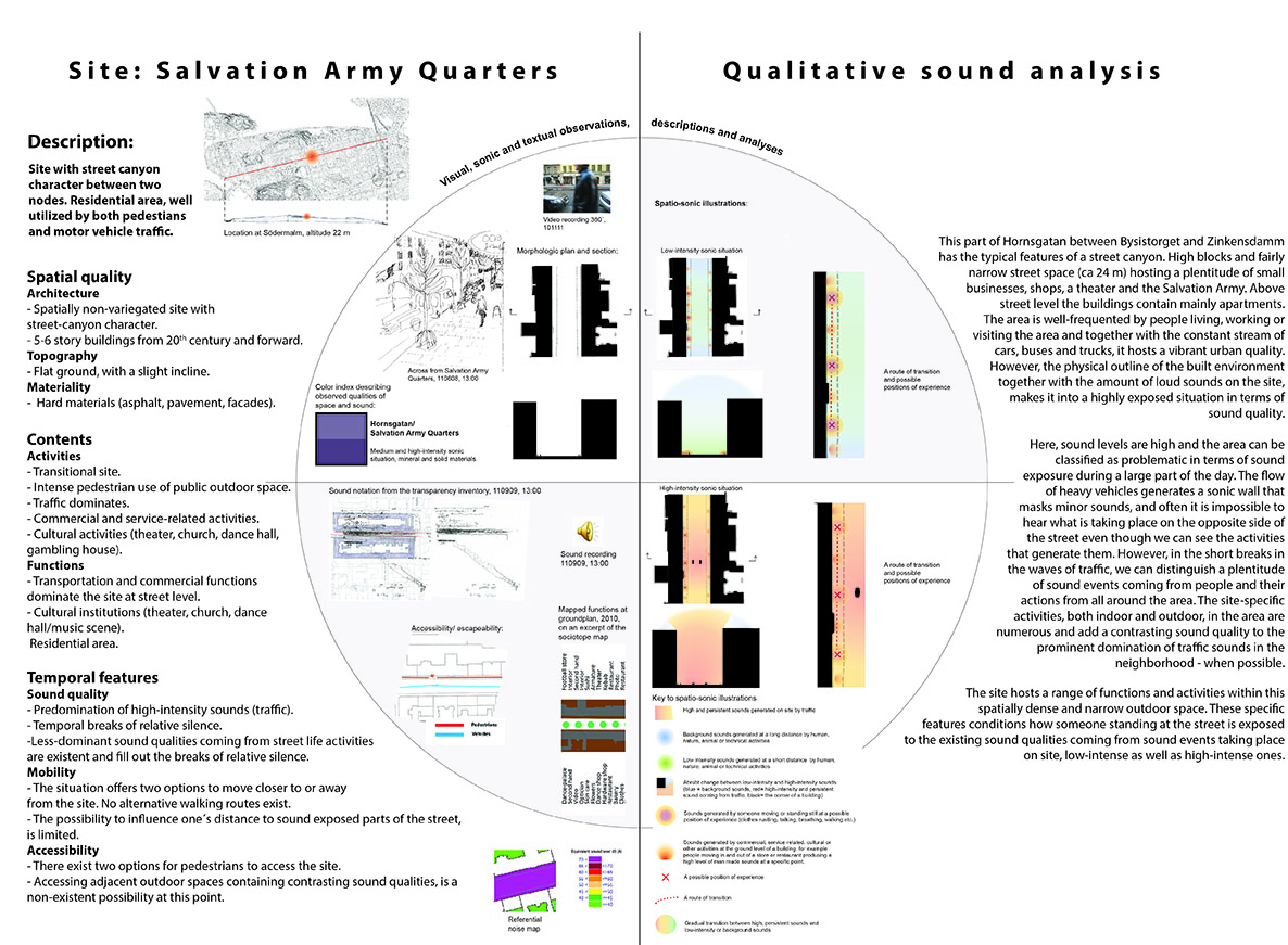 Sound in the city is an intricate phenomenon that affects us at several levels, both health-wise and socially. At the same time, sound has cultural and functional implications by mediating important information connected to identity, security and spatial orientation. Unfortunately, current quantitative methods are not sufficient for describing, analyzing and managing urban sounds in regard to this complexity. Complementary methods of representation and analysis need to be developed that will bring out important information - gathering it and making it visual - about the constitution, character and quality of urban sonic space that is possible to utilize alongside today’s calculation and measurement-based methods within such areas as architecture and urban planning practices.