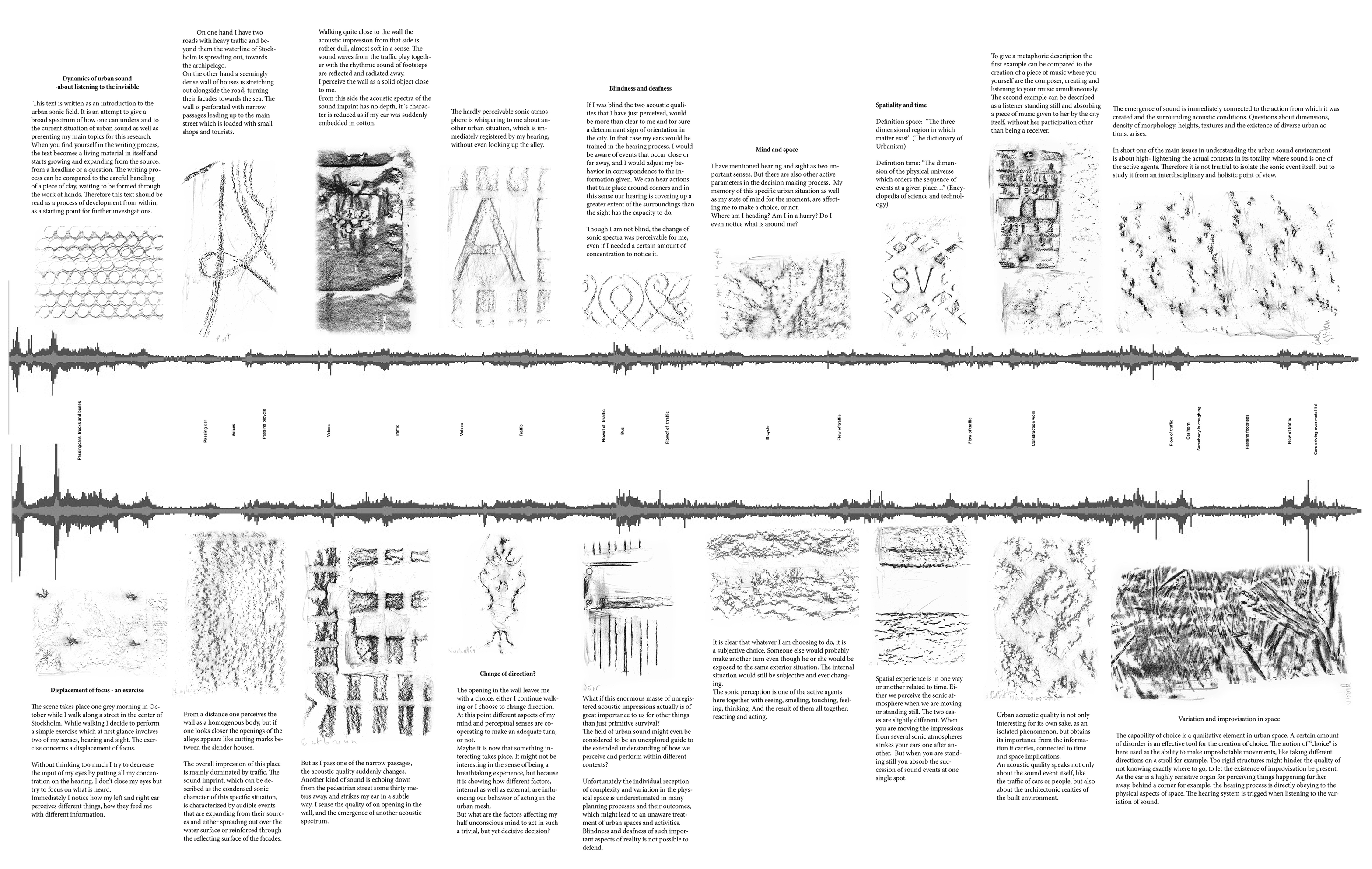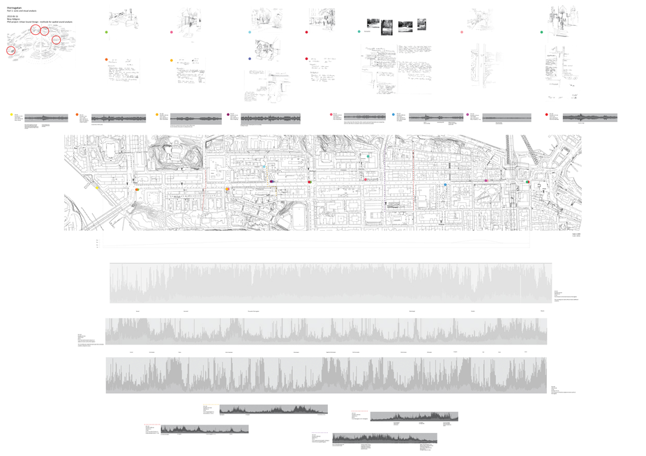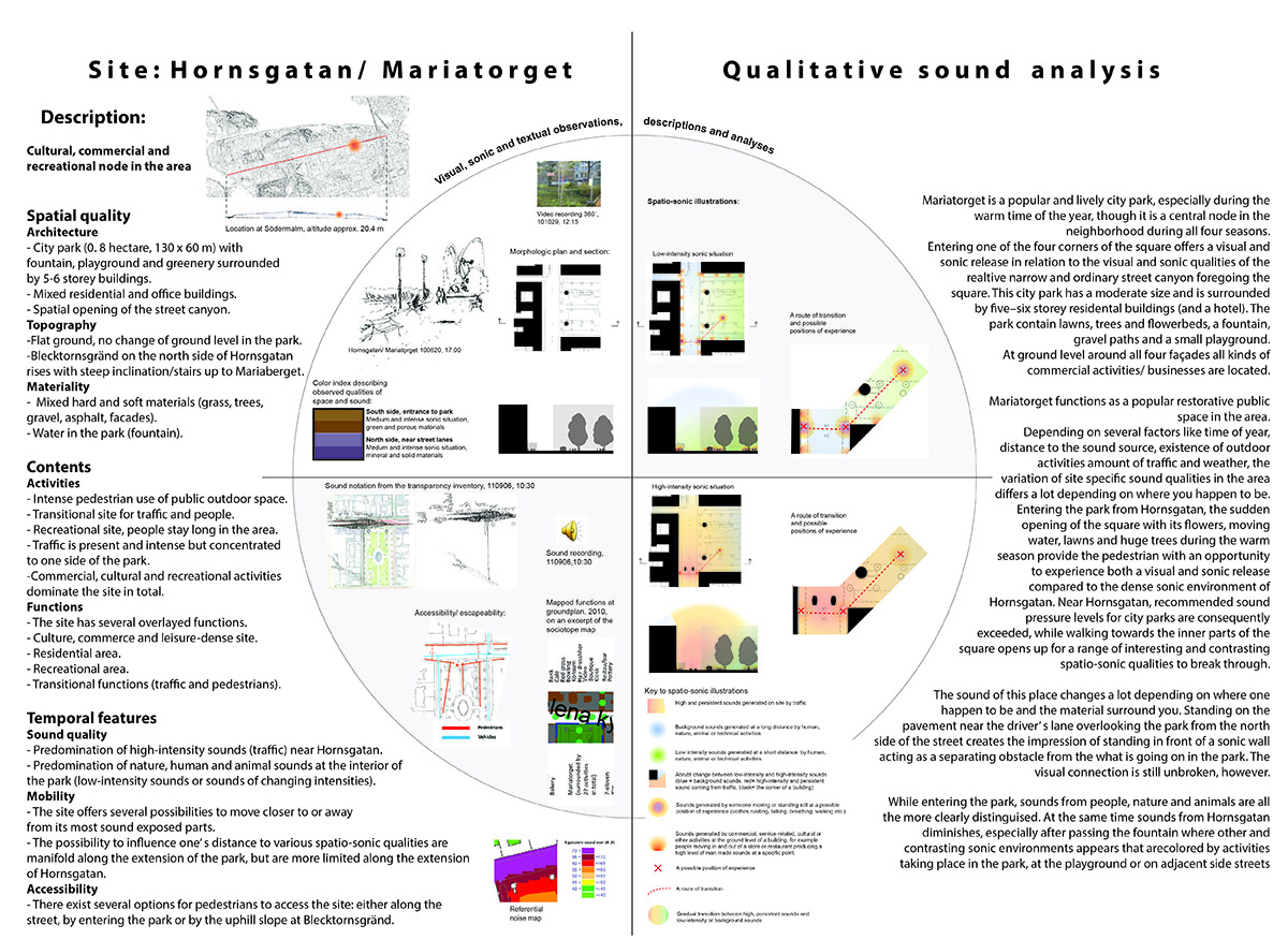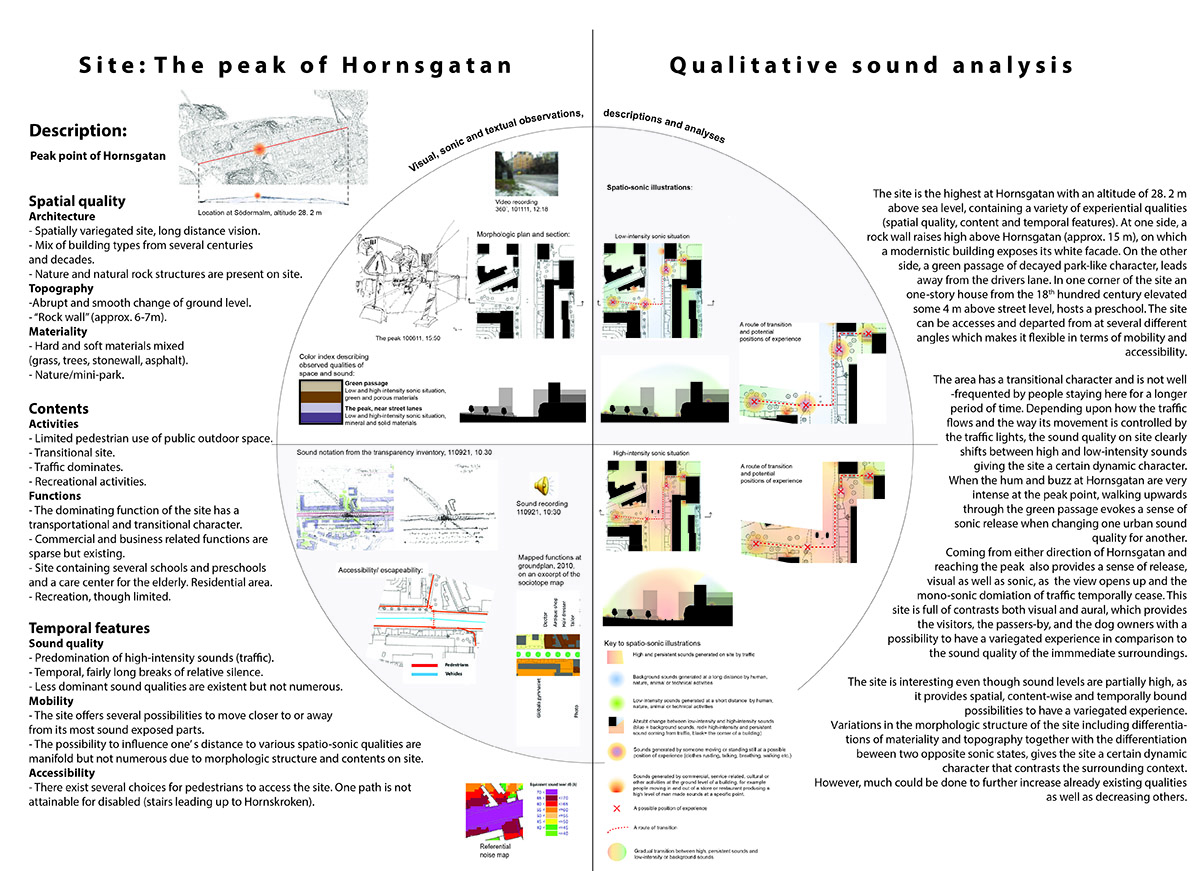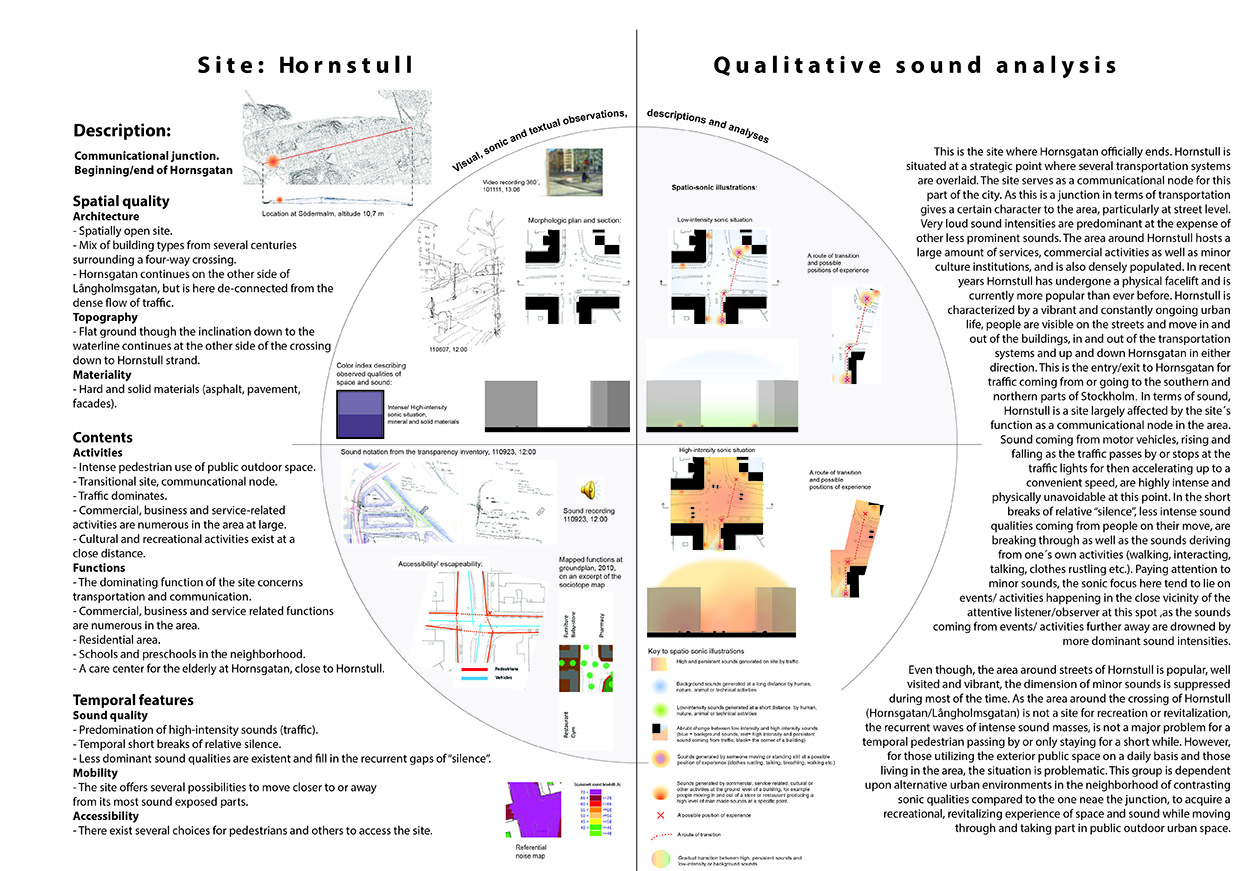 The licentiate thesis has its foundation in the analogue and well-recognized tool-box of the architect, such as various forms of documentation and sketching techniques, mapping, inventory and site-analysis, etc., when exploring tools and strategies for the communication and analysis of the exterior urban sound environment along the long and busy street Hornsgatan in Stockholm.