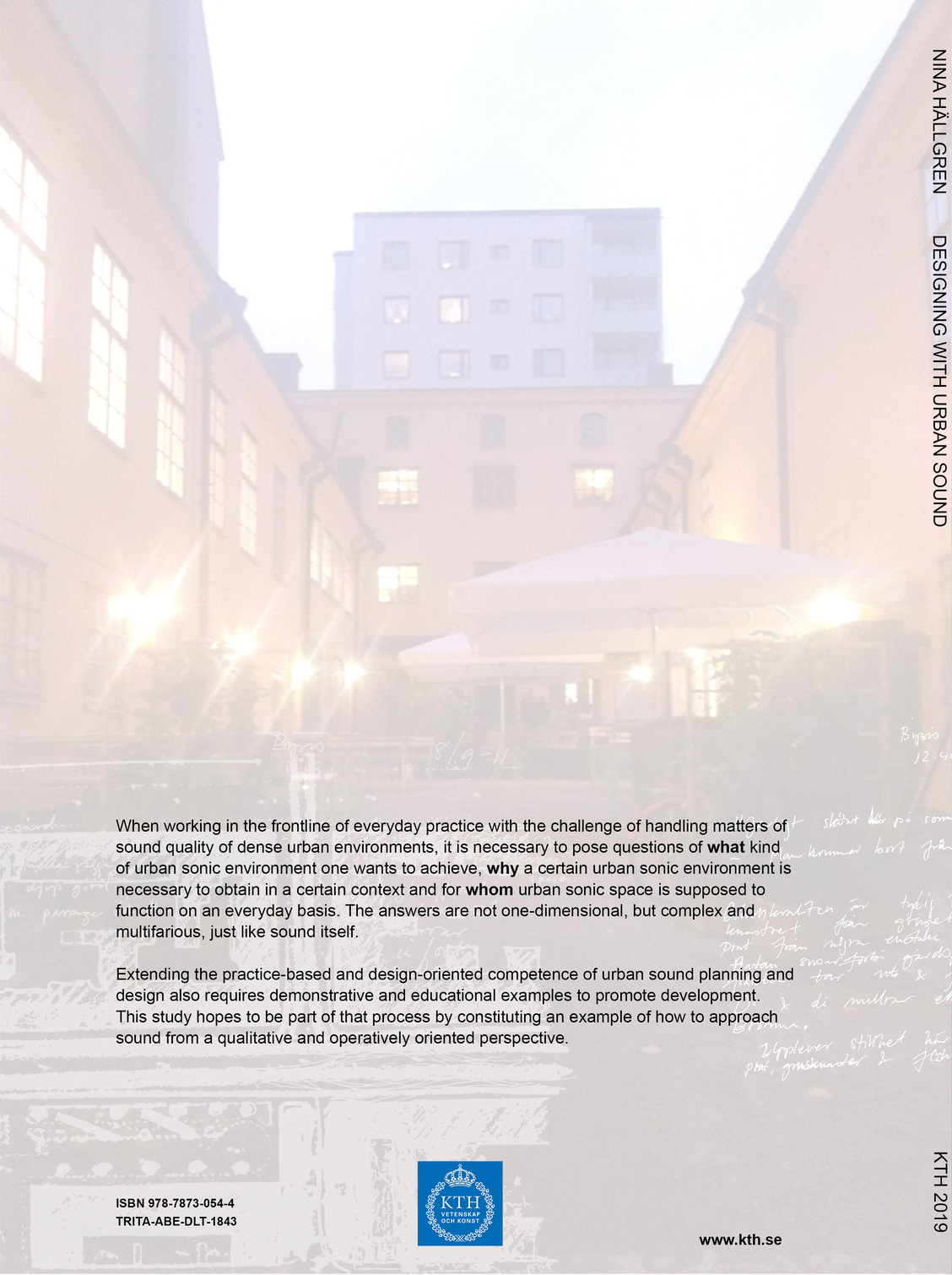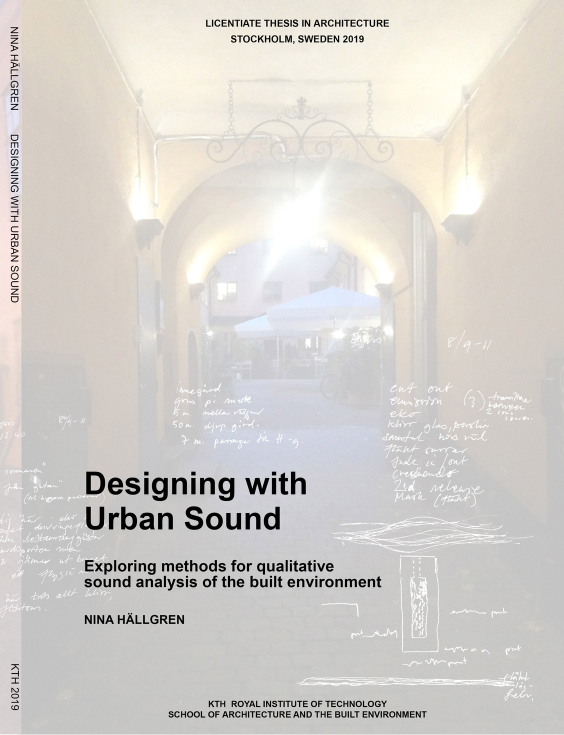 The licentiate thesis Designing with Urban Sound explores the constitution and qualitative characteristics of urban sonic space from a design-oriented and practice-based perspective. The act of lifting forth and illuminating the interaction between architecture, the creation of sound and a sonic experience aims to examine and develop useful tools and methods for the representation, communication and analysis of the exterior sonic environment in complex architectural spaces. The objective is to generate theoretical and practical knowledge within the field of urban sound planning and design by showing examples of different and complementary ways of communicating and analyzing sound than those which are commonly recognized.