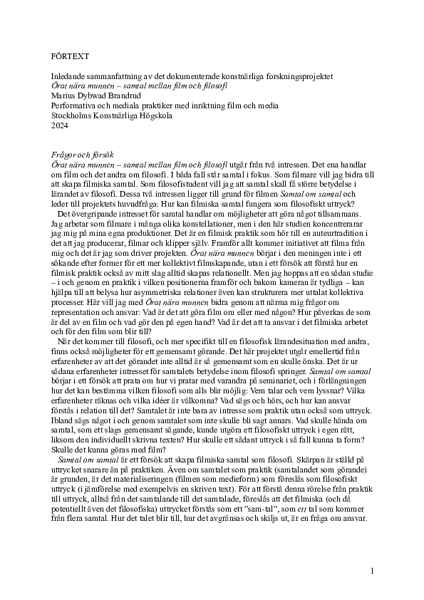 This PhD project is a study in and through filmic conversations. The project addresses the role of conversation in philosophy education. While philosophy often is manifested in individually written form, this is a study of how filmic conversation can act as philosophical expression, mainly based on the film "Samtal om samtal" which is the principal material of this PhD project. The film begins by addressing the manner of which we speak to one another in a seminar; and by extension how that manner decides which philosophy is at all made possible: Who is speaking and who is listening? Whose experiences count and whose ideas are welcome? Yet, conversation is not only of interest as practice but also as expression. Sometimes something is said through/as conversation that could not have been expressed in any other form. What would happen if conversation, as a communal way of saying things, would constitute a form of philosophical expression in its own right, on par with the individually written text? What form would such an expression be allowed to take? Could philosophy be expressed through the medium of film? In and through the filmic conversation of this study, these queries also lead on to issues of representation and responsibility: What signifies the practice of making a film about or with someone? How are those involved in a film project affected, and how can the film act (in the world) independently? How could responsibility be understood in the process of making a film and regarding the final result? In addition to "Samtal om samtal", the text "Eftertext" is submitted. The text further explores the previously mentioned questions, but adds another layer in commenting on the filmic work of "Samtal om samtal". "Eftertext" also refers to the films "Ett jag som säger vi" and "Rehearsals", as well as the document "Transkription". These works are included as appendices, forming sub studies in the process of making "Samtal om samtal".