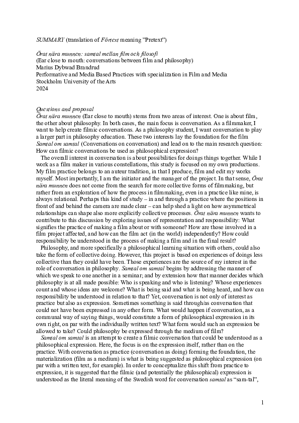 This PhD project is a study in and through filmic conversations. The project addresses the role of conversation in philosophy education. While philosophy often is manifested in individually written form, this is a study of how filmic conversation can act as philosophical expression, mainly based on the film "Samtal om samtal" which is the principal material of this PhD project. The film begins by addressing the manner of which we speak to one another in a seminar; and by extension how that manner decides which philosophy is at all made possible: Who is speaking and who is listening? Whose experiences count and whose ideas are welcome? Yet, conversation is not only of interest as practice but also as expression. Sometimes something is said through/as conversation that could not have been expressed in any other form. What would happen if conversation, as a communal way of saying things, would constitute a form of philosophical expression in its own right, on par with the individually written text? What form would such an expression be allowed to take? Could philosophy be expressed through the medium of film? In and through the filmic conversation of this study, these queries also lead on to issues of representation and responsibility: What signifies the practice of making a film about or with someone? How are those involved in a film project affected, and how can the film act (in the world) independently? How could responsibility be understood in the process of making a film and regarding the final result? In addition to "Samtal om samtal", the text "Eftertext" is submitted. The text further explores the previously mentioned questions, but adds another layer in commenting on the filmic work of "Samtal om samtal". "Eftertext" also refers to the films "Ett jag som säger vi" and "Rehearsals", as well as the document "Transkription". These works are included as appendices, forming sub studies in the process of making "Samtal om samtal".