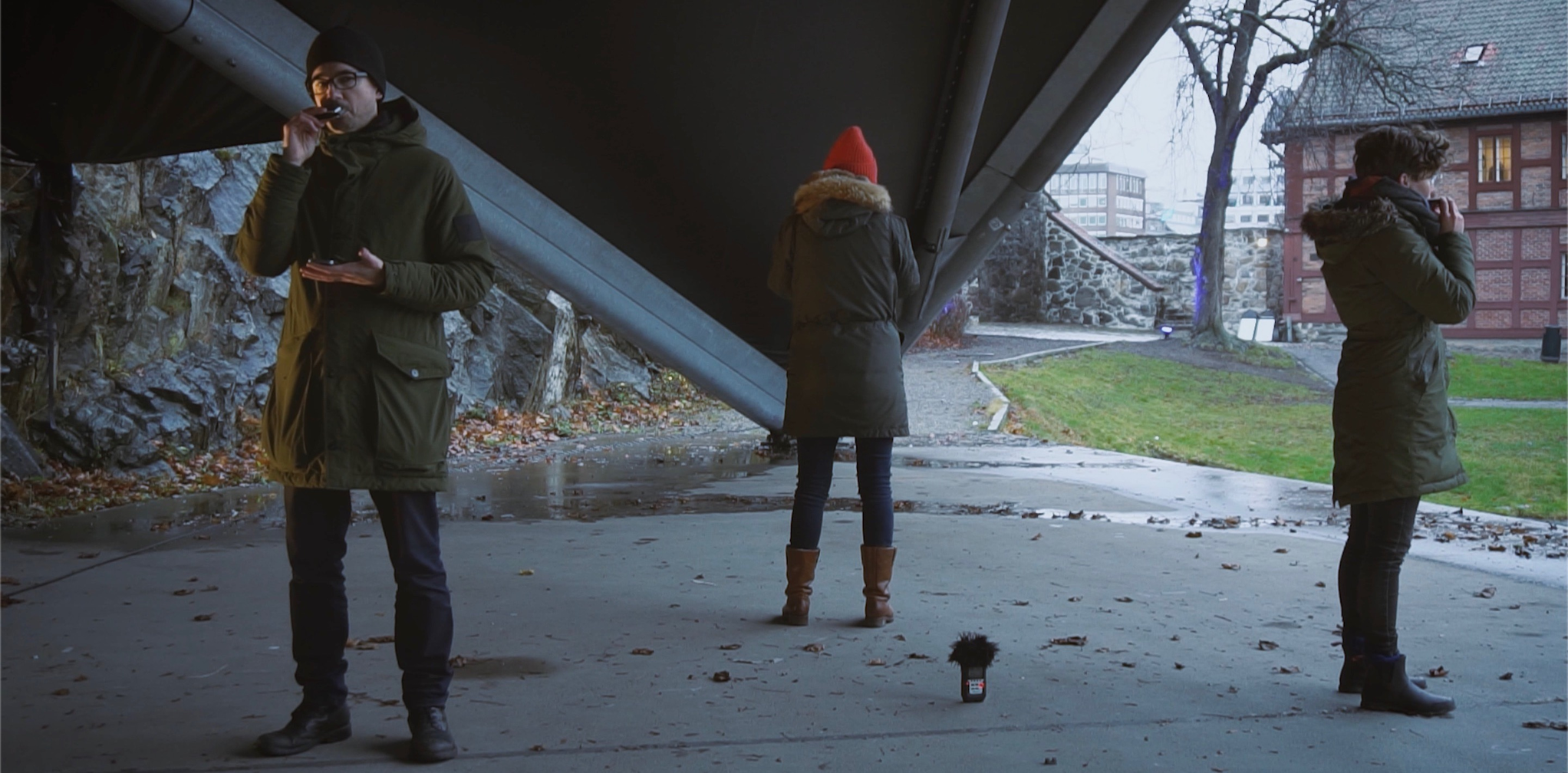 Assessing the work that we did over the research period, the impact of Covid is, not surprisingly, profound. Perhaps the image from our project that encapsulates this the most is of Jennifer and Ellen performing Mieko Shiomi’s music for two players I at an outdoor location in Oslo on 5 December 2020. When watching the film of this performance, the first thing that I noticed was a large plastic screen, placed at a point between the two performers. It is there because Shiomi’s score requires the performers to be at five different distances from each other during the course of the piece, and three of these were under the recommended minimum distance between two human beings to avoid potential transmission of Covid.