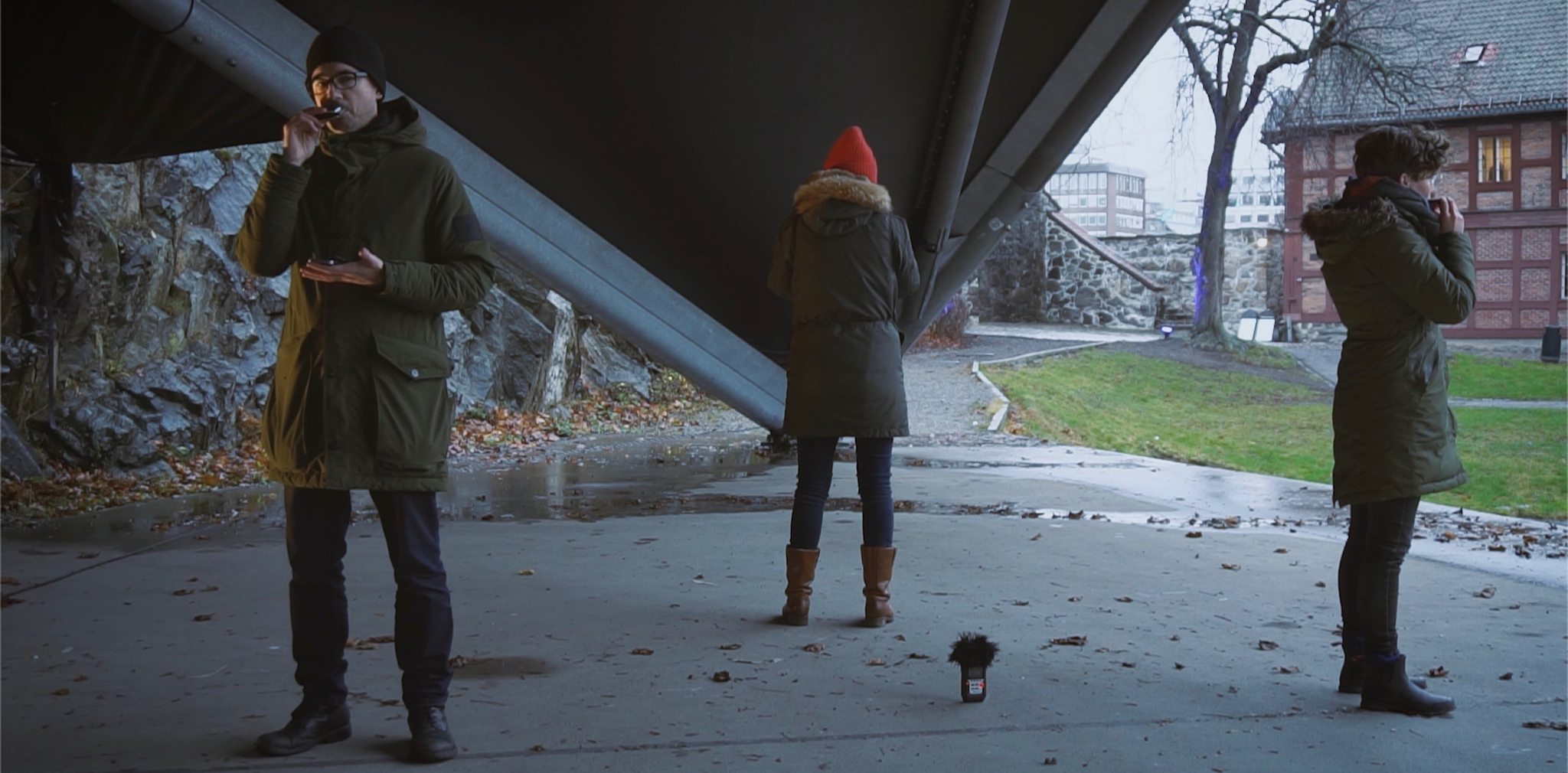 The performance environment and conditions. All the early performances took place outdoors, all in locations around Oslo. They were documented on film as part of the PP project. In the two outdoor performances in Oslo by the members of the PP research group, weather conditions were challenging; cold, rain and wind in the first one, in December 2020, and snow, ice, wind and sub-zero temperatures in the second, in December 2021.