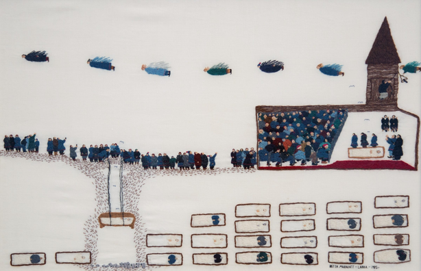 Britta Marakatt-Labba, Mátki (The Journey), 1985, embroidery, wool on linen, 46 × 70 cm, courtesy RiddoDuotarMuseat, Karasjok. Photo: Jussi Tiainen