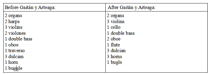 The instrumentalists began to play in the Cathedral later than the singers and were incorporated into the music chapel around January 4th of 1528. They were hiring occasionally and gradually became part of the music chapel. At this time, most instrumentalists knew how to play more than one instrument and this was a point in their favour when they were hired. When Gaitán began as masestro de capilla in 1752, there were a total of 10 instrumentalists in the chapel (see table below). When he retired in 1780 there were a total of 15 instrumentalists (see table below).