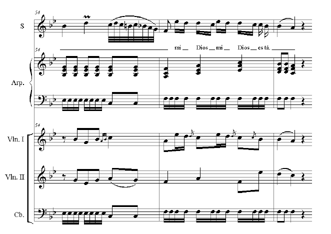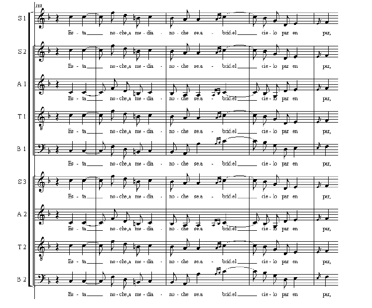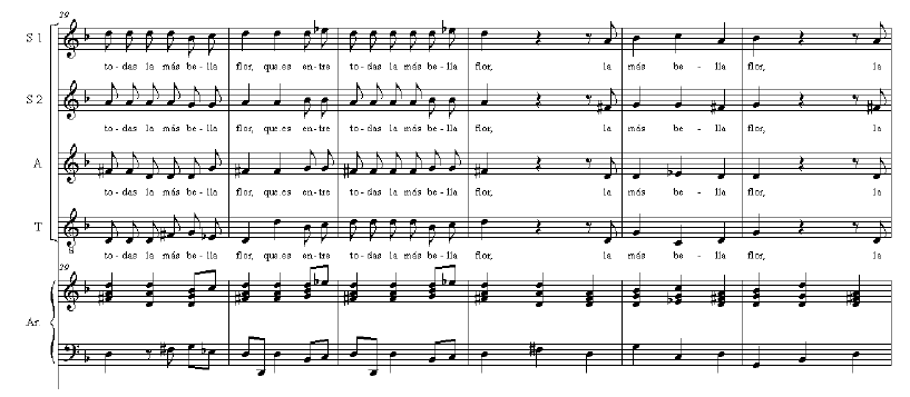 The tenor voice was used as a soloist in some villancicos, alternating with the soprano voice and it moved in a very broad register. In Jardinerito del Huerto Cerrado where the tenor sing jumps of 4th, 5th and 8th. Their relationship with the text is usually syllabic, except for solos where melismas may appear at the end of the sentence and coinciding with the accent of the word.