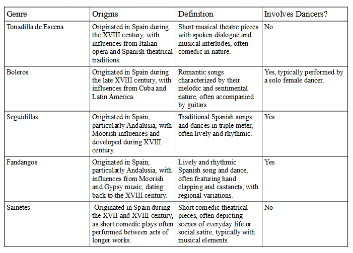 The analysis of theatrical activity through the press of the XVIII and early XIX centuries allows to confirm the acceptance of traditional Spanish music and dances such as sainetes, tonadillas de escena, or seguidillas, all of which are considered part of the pre-flamenco genre and were represented in theatres during that time.