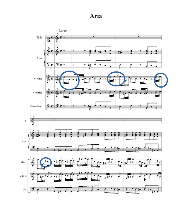 The instrumental introduction of the tonadilla de escena was a fundamental part of these pieces. It usually consisted of an initial instrumental section preceding the vocal performance, setting the musical and thematic tone for what follows with the singer(s). Instrumental introductions were typically short and could vary in style and composition, often featuring upbeat and catchy tunes. Instruments such as the guitar, lute, or other string and wind instruments were used to create these introductions in the tonadilla de escena, enhancing the theatrical atmosphere and laying the ground work for the development of the piece. This instrumental introduction is found in the villanicos of Gaitán y Arteaga. In the ecclesiastical villancico, the introduction might foreshadow the thematic material of the text, while in the tonadilla, it might set the stage for the comedic or dramatic elements of the piece. In both forms, the introduction typically provided a transition to the vocal sections of the piece. In the Aria Voy buscando mi cordero, the instrumental introduction that gives musical context to the listener. See example (audio and score) below.
