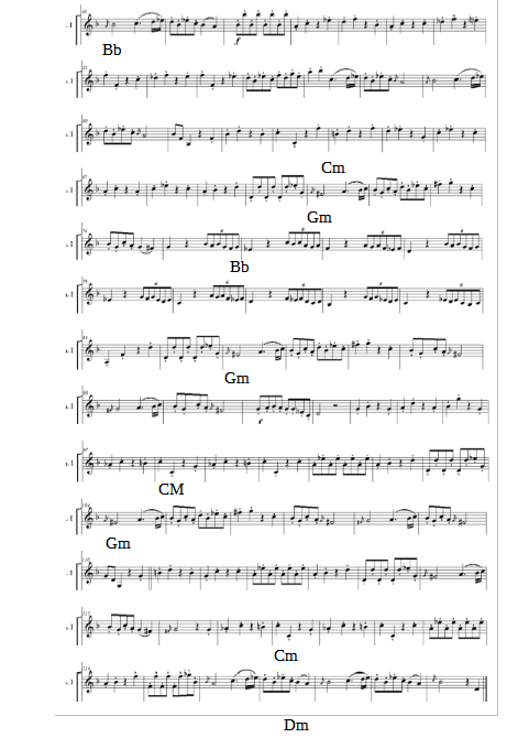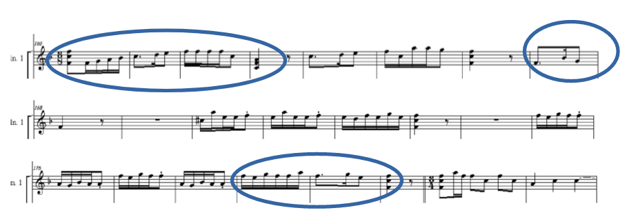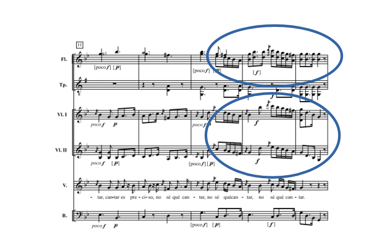 In the tonadilla de escena the pieces are very light in character, easy to hum and within a harmonic context where predominant tonal schemes are tonic-dominant-tonic or tonic-subdominant-dominant-tonic. Related to tonalities, tonadilla is a genre that stayed in the same tonality due its intention of sharing the message across to the public with lyrics that are easy to learn and without much technical complexity. Strange modulations are avoided, since they only occur to neighbour tonalities. Juan Manuel will stay in the same tonalities in the villancicos analysed in this research, however, after the concert made it on November 2023 at The Hague Conservatory, I could observed that in the piece Cual Salta el Gozo the tonalities will change in the piece to give the listener the expression of sadness, melancholic and intimate music. See the example (video and part of the score, violin I).