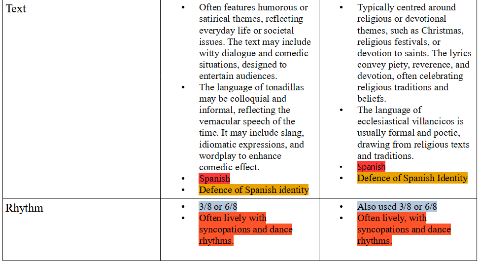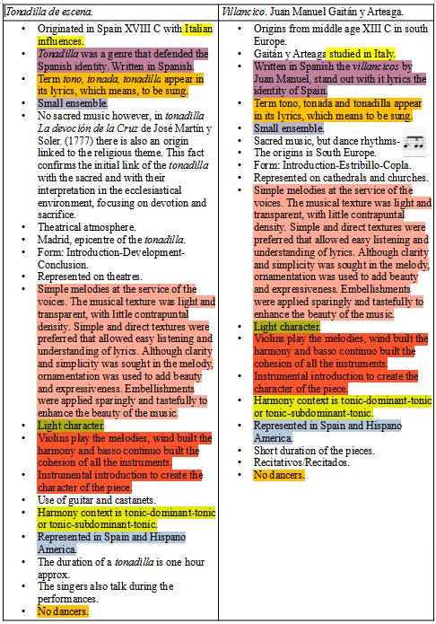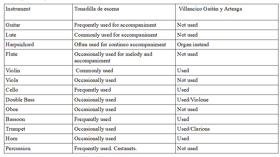 The orchestra gives support to the voice/s in the tonadillas and in the villancico of Gaitán y Arteaga in which the voice/s are the main protagonist as usual in early classicism. With clear functional distinction of the different groups of instruments, that provides a global cohesion to the compositions. See below in the table the instruments used in the tonadilla de escena and Gaitán y Arteaga´s villancicos.