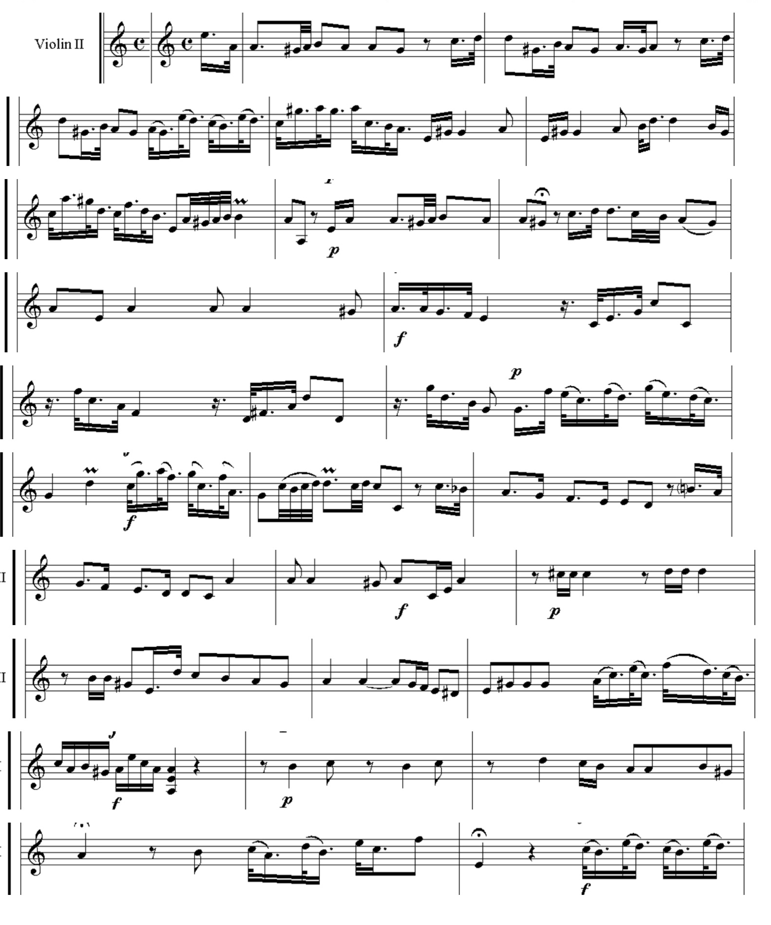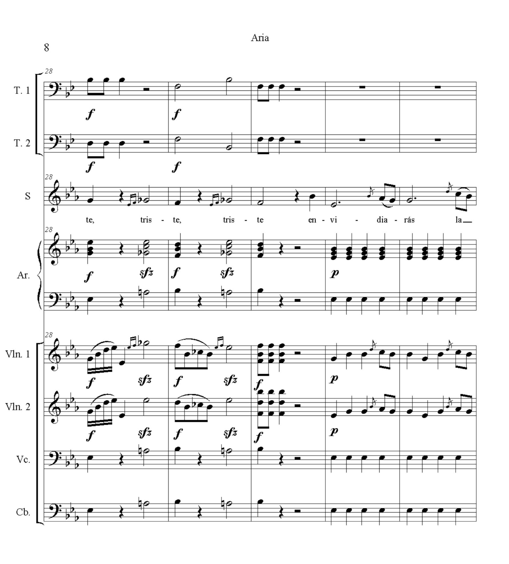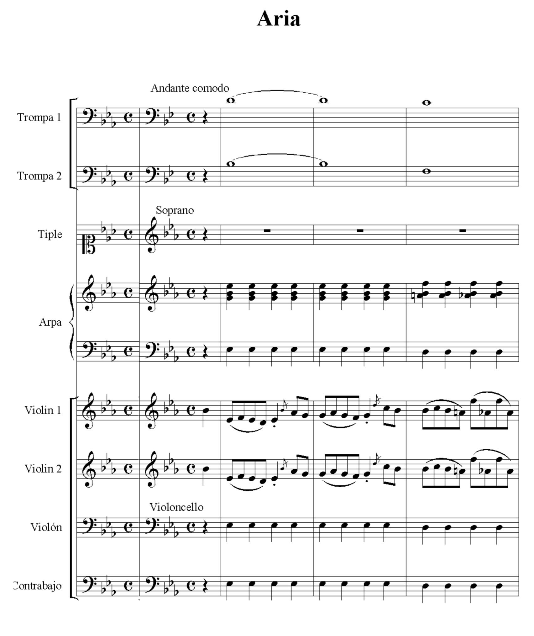 The use of the violins give movement and fluidity to the music, while the wind instruments built the harmonic cushion on which the tonal structure of the compositions were based. Consequently, the basso continuo, normally formed by a double bass, a violone or cello and a continuo instrument, such as a harpsichord or an organ have the cohesive function in the pieces. As an example of is Eternamente triste, where the violins provide the melody from the introduction and support the voices during the piece (see score and audio below). On the other hand, the winds, double bass, violone/cello and harpsichord reinforce the melody with the harmony. In general, the instruments with the greatest melodic flexibility are the violins in this piece, although, when the voice enters, the violins accompany with easy melody (see the table below).