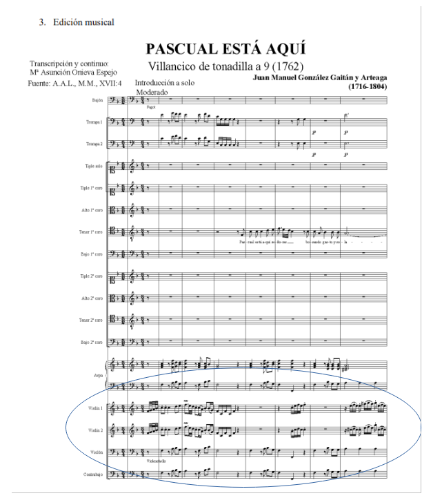 In comparison with Jacinto Valledor (see score below), a Spanish composer from XVIII century who composed tonadillas as La españolizada, and with non-ecclesiastic lyrics, I found relation in term of rhythms with Pascual está aquí (see score below). The time signature is 3/8 in both pieces and usually contains several movements such as coplas, seguidillas, tirana or minuet. Gaitán y Arteaga respects the form of tonadillas (estribillo-copla estribillo) when he composed the villancico Pascual está aquí, although usually the introduction of tonadillas form is longer until the singer(s) starts to perform. He composed a small introduction of few bars and the singer, in this case the tenor, will start to sing some bars later. Tonadillas contained parolas (speaking text without any musical accompaniment); in this case and because of religious relation, Juan Manuel will not do that in the piece. Also, Juan Manuel composed Pascual está aquí with rhythm of a dance, which is particularly special because dancers were not allowed in the ecclesiastical music.
