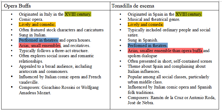 The tonadilla de escena in XVIII century Spain was influenced by Italian opera buffa. During the XVIII century, Spain experienced significant cultural exchange with Italy. This exchange facilitated the flow of artistic ideas, including musical styles, between Spain and Italy. Italian opera, particularly opera buffa, was highly popular throughout Europe during the XVIII century, including in Spain. The lively and comedic nature of Italian opera buffa appealed to Spanish audiences and influenced the development of the tonadilla de escena. Spanish musicians often travelled to Italy to study music, as Juan Manuel did, and Italian musicians were sometimes employed in Spanish courts and theatres, such as Domenico Scarlatti, Luigi Boccherini, or Gaetano Brunetti. This interaction between Spanish and Italian musicians contributed to the cross-pollination of musical styles between the two countries. See the table below.