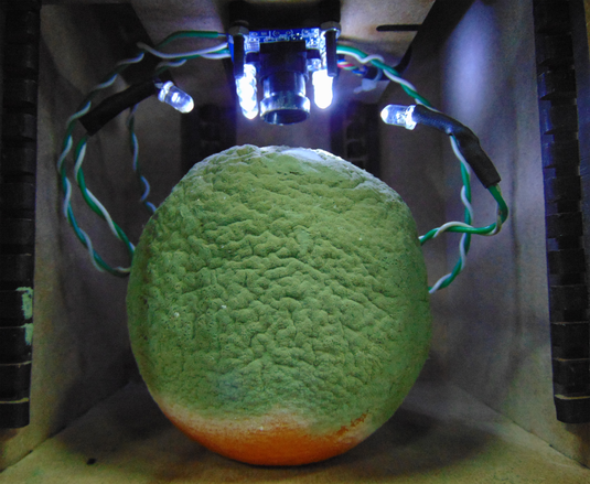 Ana Laura Cantera, "Evolution de una partida" :the work recounts the fading, weakness and transformation of matter through communities of microorganisms that communicate, degrade and interact through digital data. Through degenerative processes, this mechanical device allows to visualize the processes of death, genesis and recomposition occurred in the cycle of matter