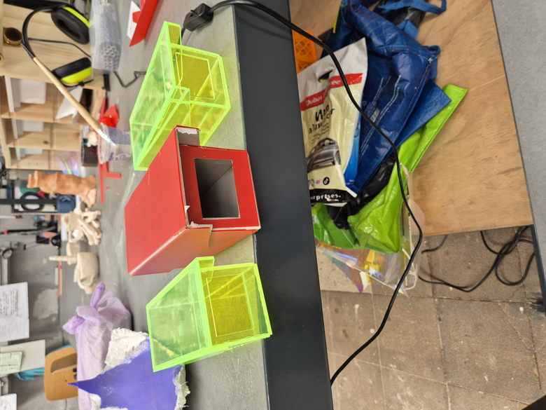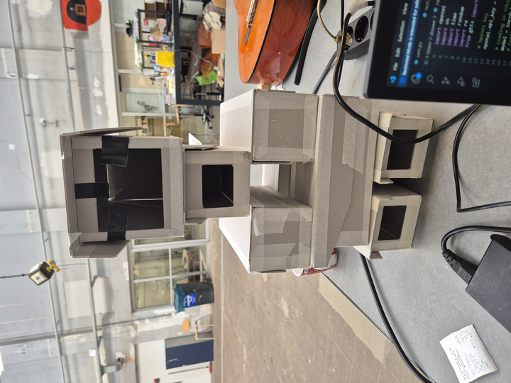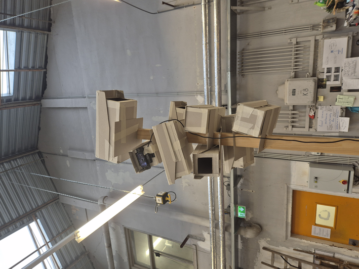 This investigative journey started with photographing surveillance cameras during strolls, later reflecting on these photographs. However, an urge arose to make my own camera models, to dictate their placement and experiment with their arrangement within a given space. I ventured to make the 'invisible' surveillance visible, aligning with my research. I embarked on creating pieces that would not only expose instances of surveillance but would turn them into characters and therefore creating presence, assigning them roles beyond their typical function. Yet, as the collection evolved, I recognized a potential oversight—a lack of tangible connection to scenography within the work, just mostly models of cameras.