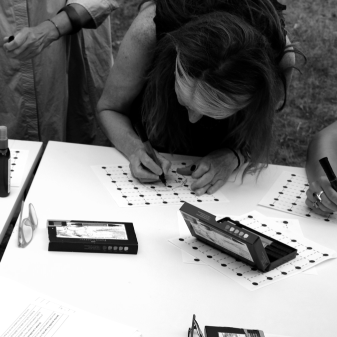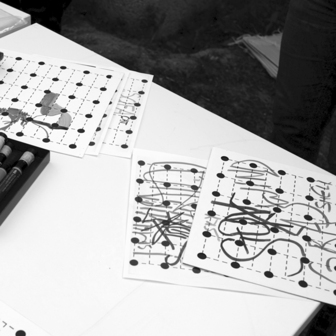 Following the workshop, I developed the workshop text into a digital booklet (available below as a PDF). This text and its re-presentation in this booklet format is a response to the way that my understanding of the workshop developed through its facilitation. The grey text is the workshop text prepared for Convocation II; the highlighted text was written during the workshop in response to the activity; whilst the redacted text was prepared for the workshop but remained unarticulated. The images that accompany the words have been generated from the tactile grid that participants used to make their drawings. As participants explored the grid blindfolded, that structure’s temporal qualities came to the fore, enabling it to relinquish its modernist associations and blend with the garden. This blending was expressed by the participants in dialogue and through their drawings. It is represented here through the deconstruction of the grid’s formal elements in line with the participant’s discoveries.