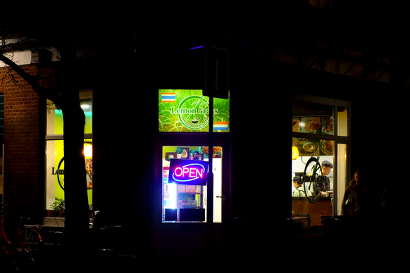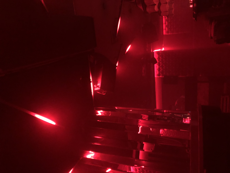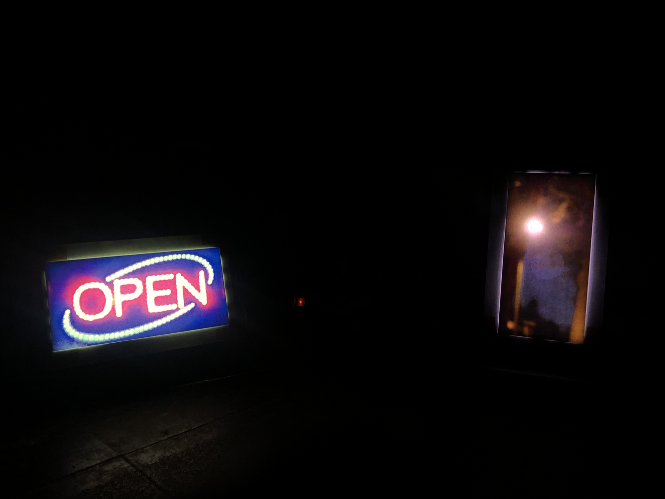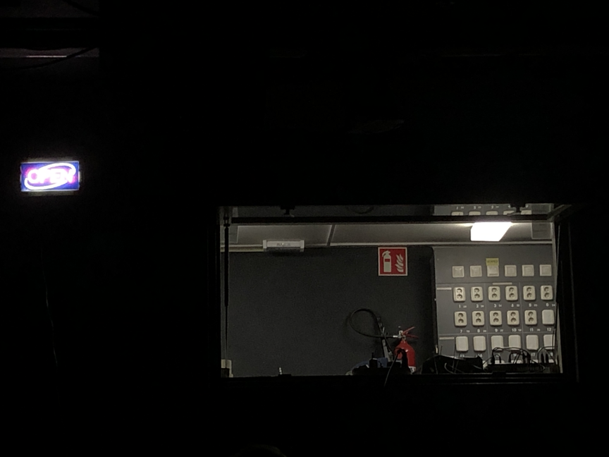 For the first experiment I did I tried to suggest the atmosphere of a night shop through it’s most common and recognisable element : the open sign. After taking a closer look at my photographs I saw that for some reason all snack-bars and night shops have the exact same “open sign”. I then tried to recreate it using an LED light and a printout. Each of us had been asked to present something from our collection in the Kleine zaal, straight away my attention turned to the back of the theatre. I was able to suggest the window of a night shop by highlighting the backstage area and hanging the open sign above it. I also paced a speaker inside it with some ambient music to create a dreamy atmosphere. I thought it was interesting to draw the attention of the spectators to a part of the theatre that is supposed to stay hidden. It was also a good visual metaphor to show how the nighttime changes the face of the city.