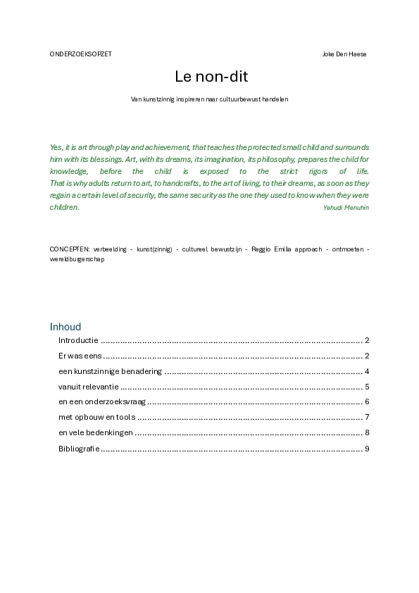 Aan de basis van dit onderzoek ligt mijn passie voor mijn vak, voor kinderen en voor de opleiding. Ook in de getuigenissen van studenten, die ik in portfolio’s sprokkelde en verzamelde tijdens de opdachten binnen de opleiding, haalde ik o.a. inspiratie voor mijn onderzoeksvraag.
