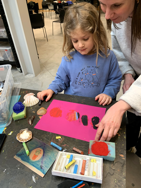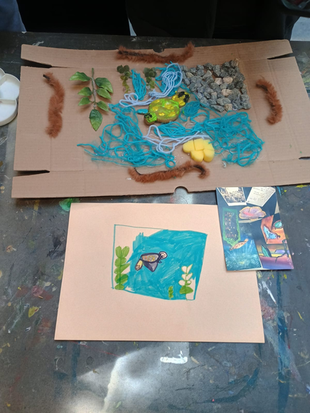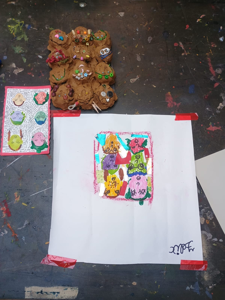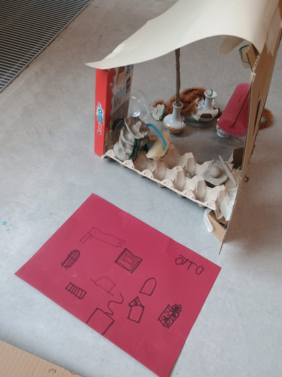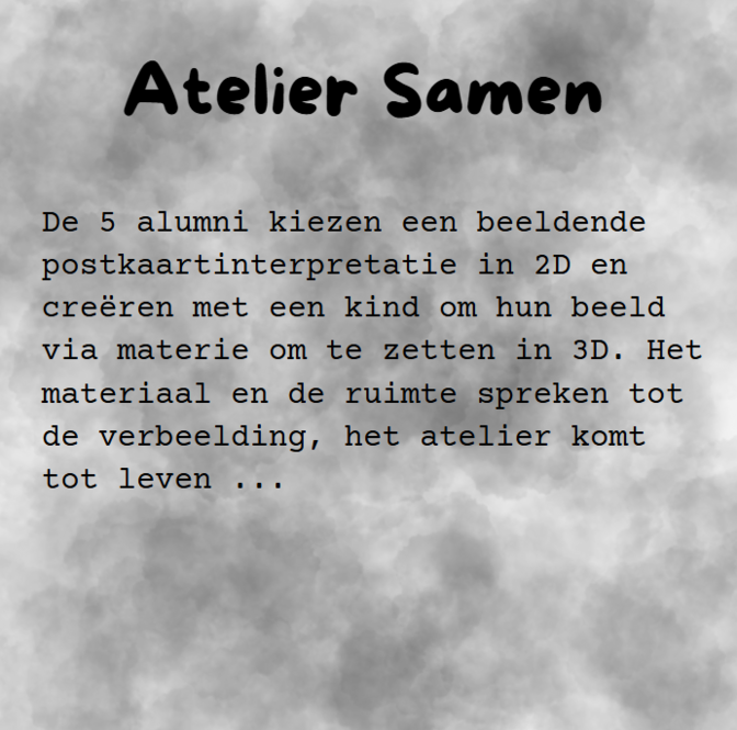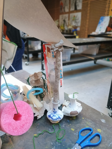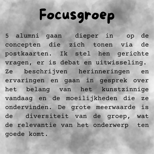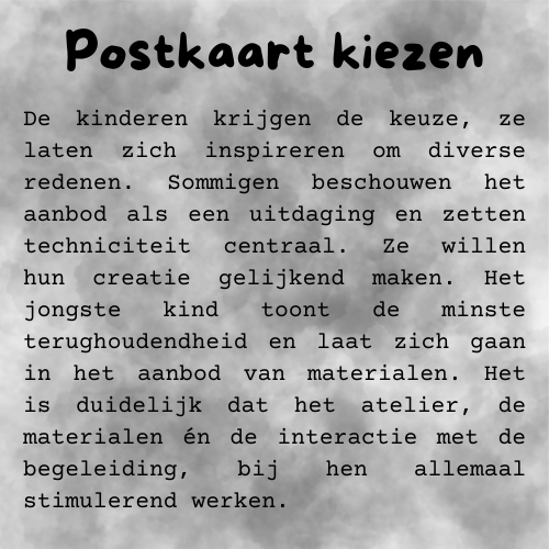En als ik helemaal eerlijk ben, dan zijn kinderen wel een drijvende kracht voor mijn kunstzinnigheid, maar dan puur uit ideologie (externe motivatie) . Ik geloof dat kinderen baat hebben bij kunstzinnigheid en openheid en 100 talen. En om "echt" te zijn daarover met kinderen, vind ik dat ikzelf er iets van moet afweten en kunstzinnigheid zelf moet praktiseren. Dus om in mijn werk met kinderen hun daar veel aan bloot te stellen [sic], werk ik actief om mijzelf er veel aan bloot te stellen. (M)