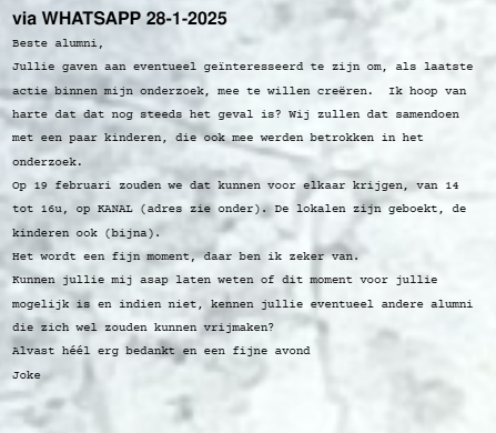 12 december 2023 - Bij het blij weerzien van 2 alumni en hun grote bereidheid om mee te werken aan het onderzoek, besefte ik tegelijk dat dit té makkelijk is, dat ik de tegenstem MOET zoeken. Deze uitdaging is helpend en sturend maar ook moeilijk.