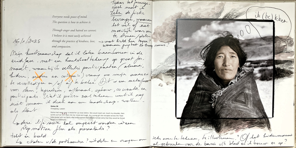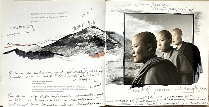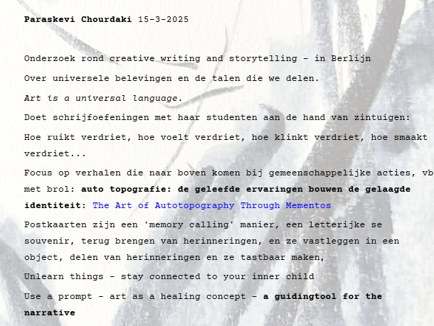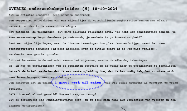 Ik vind onderzoek boeiend, ik vind het moeilijkste, nog steeds, keuzes maken, elimineren en focussen. Alles is bruikbaar, zinvol en interessant.De teken-intermezzo's helpen me wel, het zijn rustmomenten, het is tussen-tijd..en ik val stil.