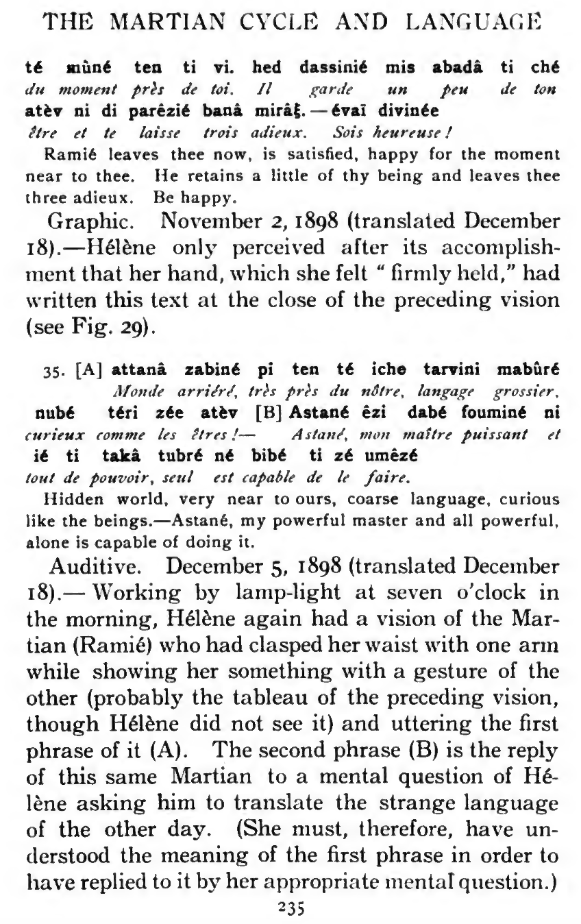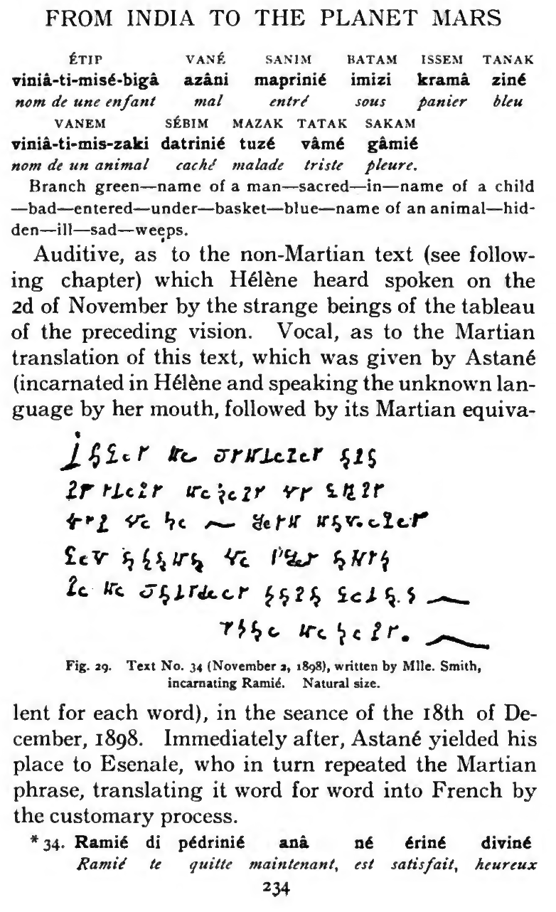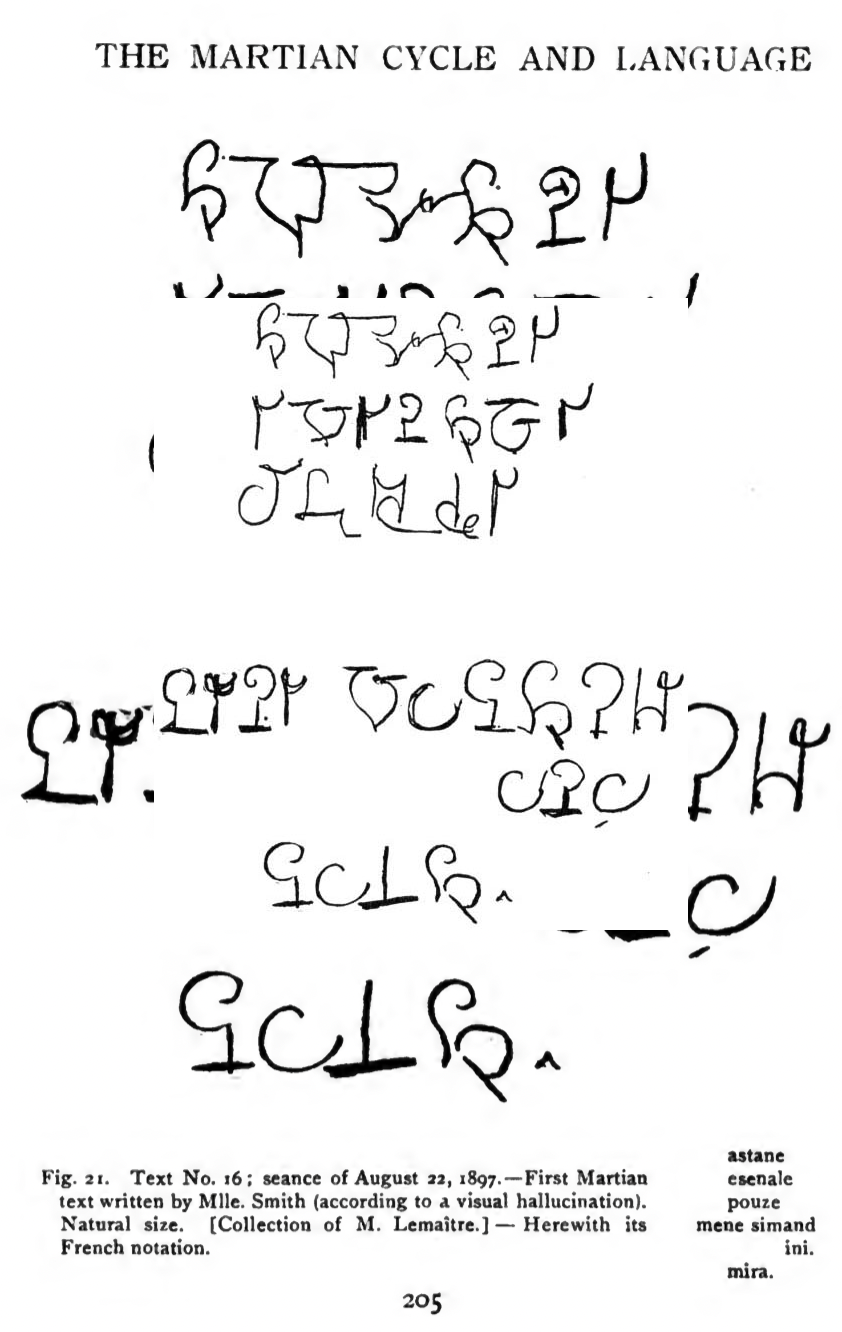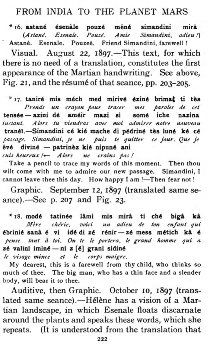 After various characteristic symptoms of the departure for Mars... Hélène went in a deep sleep... [Léopold] informs us that she is en route towards Mars; that once arrived up there she understands the Martian spoken around her, although she has never learned it; that it is not he, Léopold, who will translate the Martian for us — not because he does not wish to do so, but because he cannot; that this translation is the performance of Esenale, who is actually disincarnate in space, but who has recently lived upon Mars, and also upon the earth, which permits him to act as interpreter. (Flournoy 1901, 165-6)