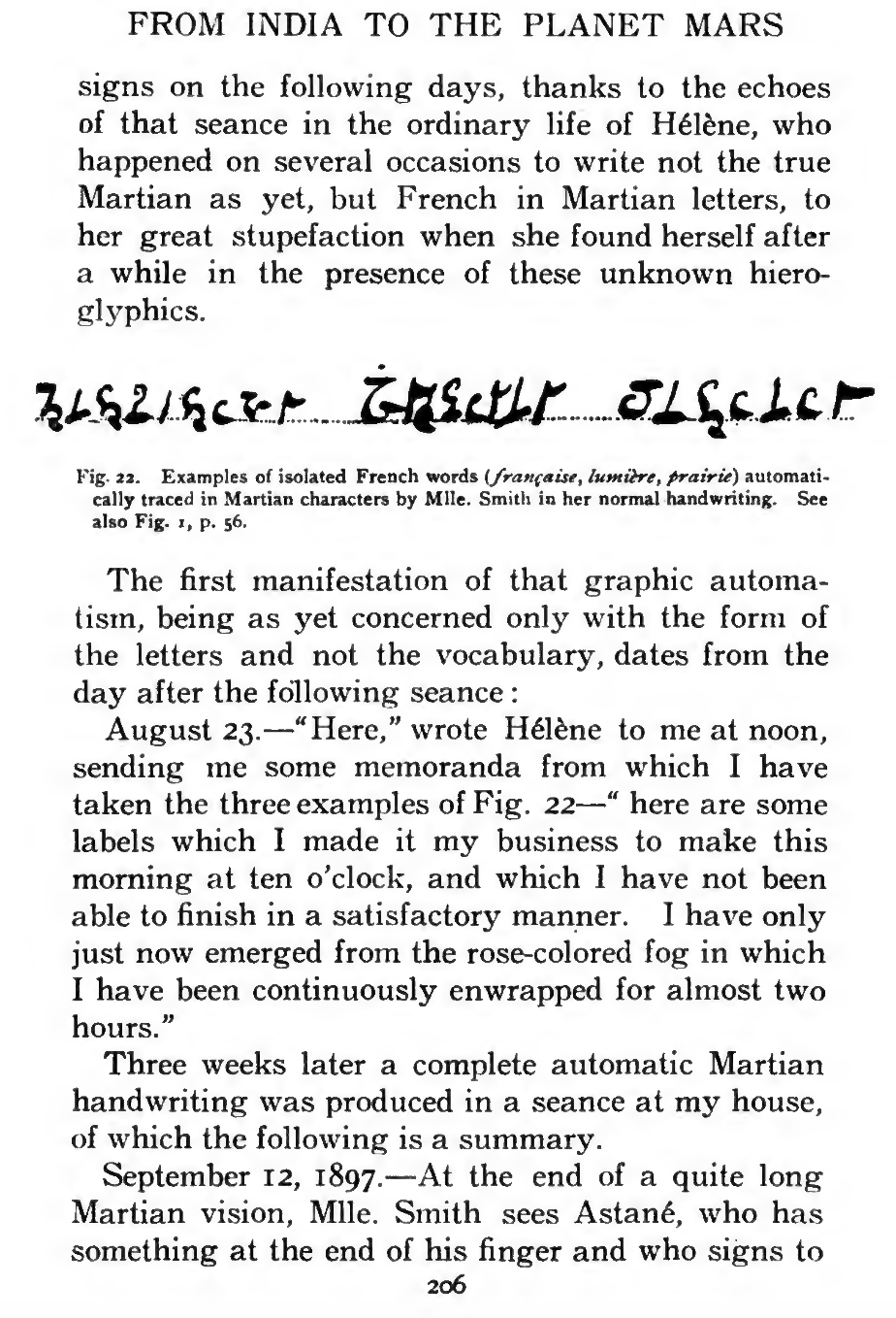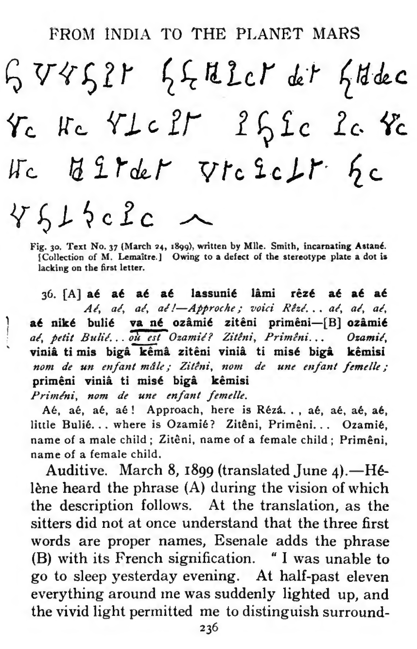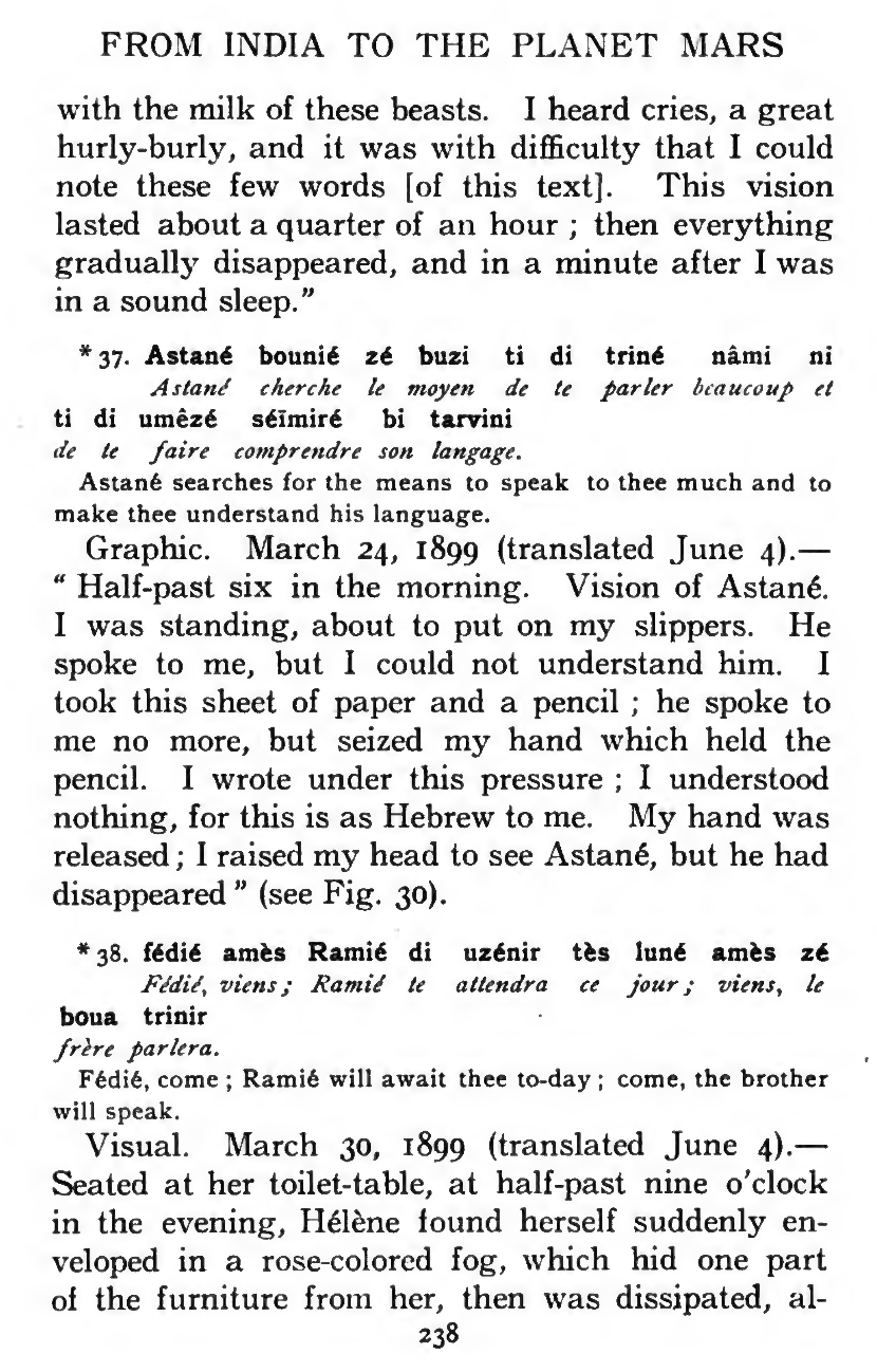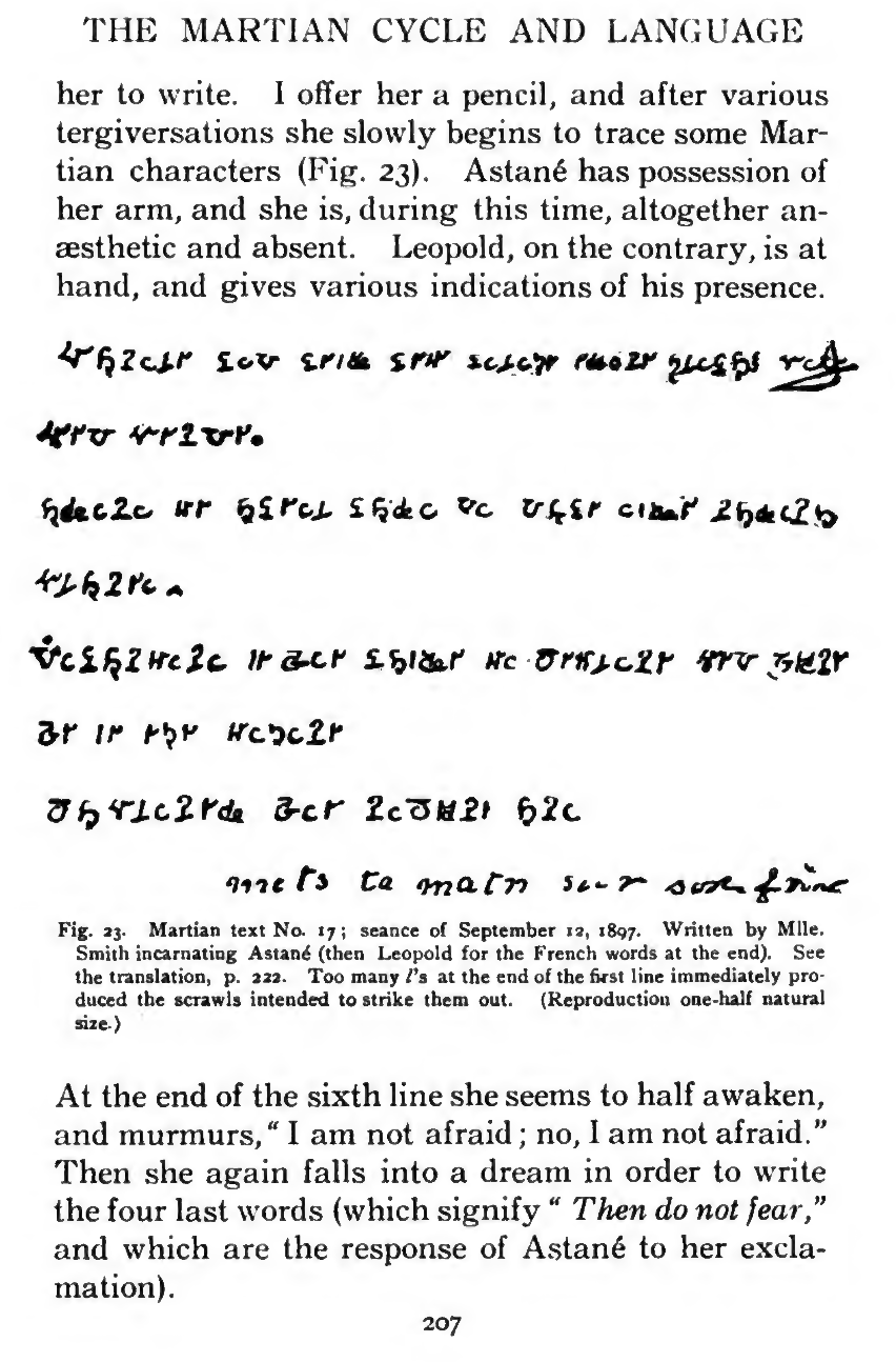 After various characteristic symptoms of the departure for Mars... Hélène went in a deep sleep... [Léopold] informs us that she is en route towards Mars; that once arrived up there she understands the Martian spoken around her, although she has never learned it; that it is not he, Léopold, who will translate the Martian for us — not because he does not wish to do so, but because he cannot; that this translation is the performance of Esenale, who is actually disincarnate in space, but who has recently lived upon Mars, and also upon the earth, which permits him to act as interpreter. (Flournoy 1901, 165-6)