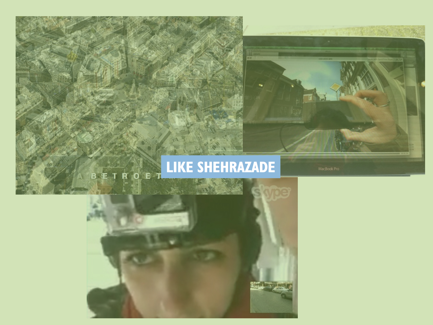 ‘Meeting Cities’ is a crossover tour and a parallel city walk. A person in Amsterdam walks 400m direction West together with a person walking 400m direction West in Beirut, ending on their respective roofs. The parallel walk is arranged over Skype, on a tablet, with a camera at the back side. They exchange the view of their walk.